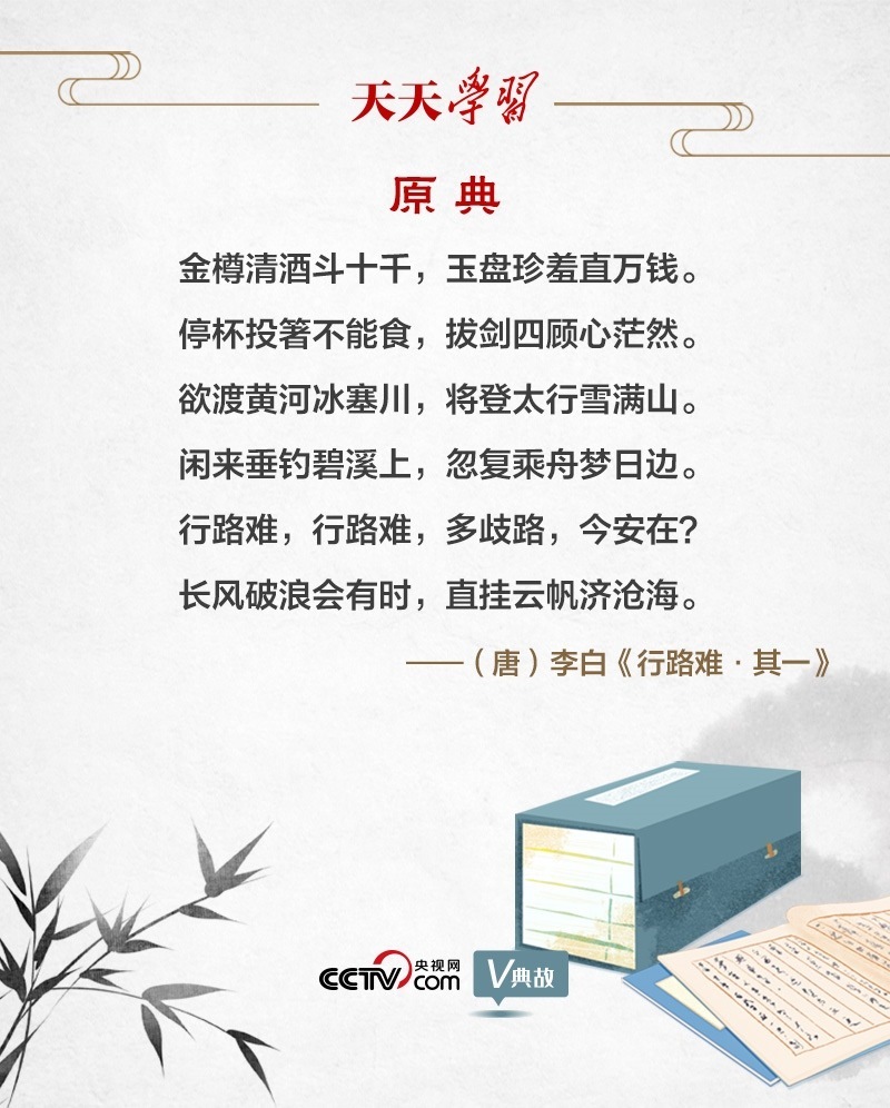 “行路難”為樂府古題,多詠嘆世路艱難及貧困孤苦的處境。李白的《行路難》共三首,“長(zhǎng)風(fēng)破浪會(huì)有時(shí)”出自第一首。唐天寶元年(742年),李白奉詔入京,擔(dān)任翰林供奉。后因權(quán)臣讒毀排擠,被“賜金放還”?!缎新冯y》便是李白離開長(zhǎng)安時(shí)所作。