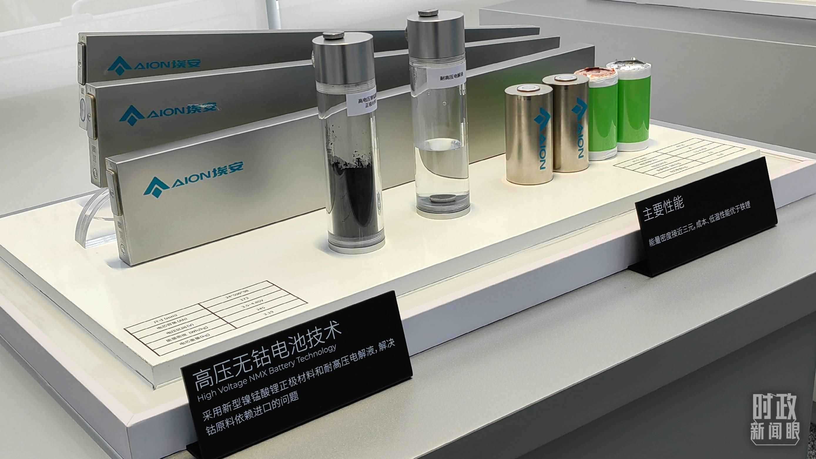 △廣汽埃安展示的高壓無鈷電池技術,采用新型鎳錳酸鋰正極材料和耐高壓電解液,解決了鈷原料依賴進口的問題。(總臺央視記者張曉鵬拍攝)