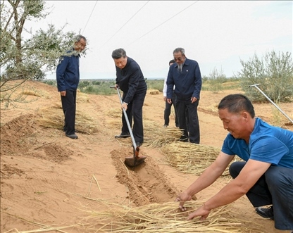 △2019年8月21日,正在甘肅考察的習(xí)近平總書記來(lái)到古浪縣八步沙林場(chǎng)??疾熘?,他拿起一把開溝犁,參與到治沙勞動(dòng)中。