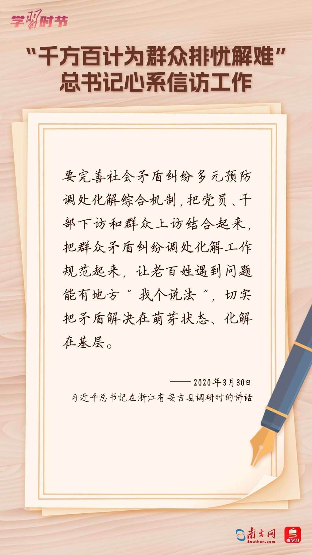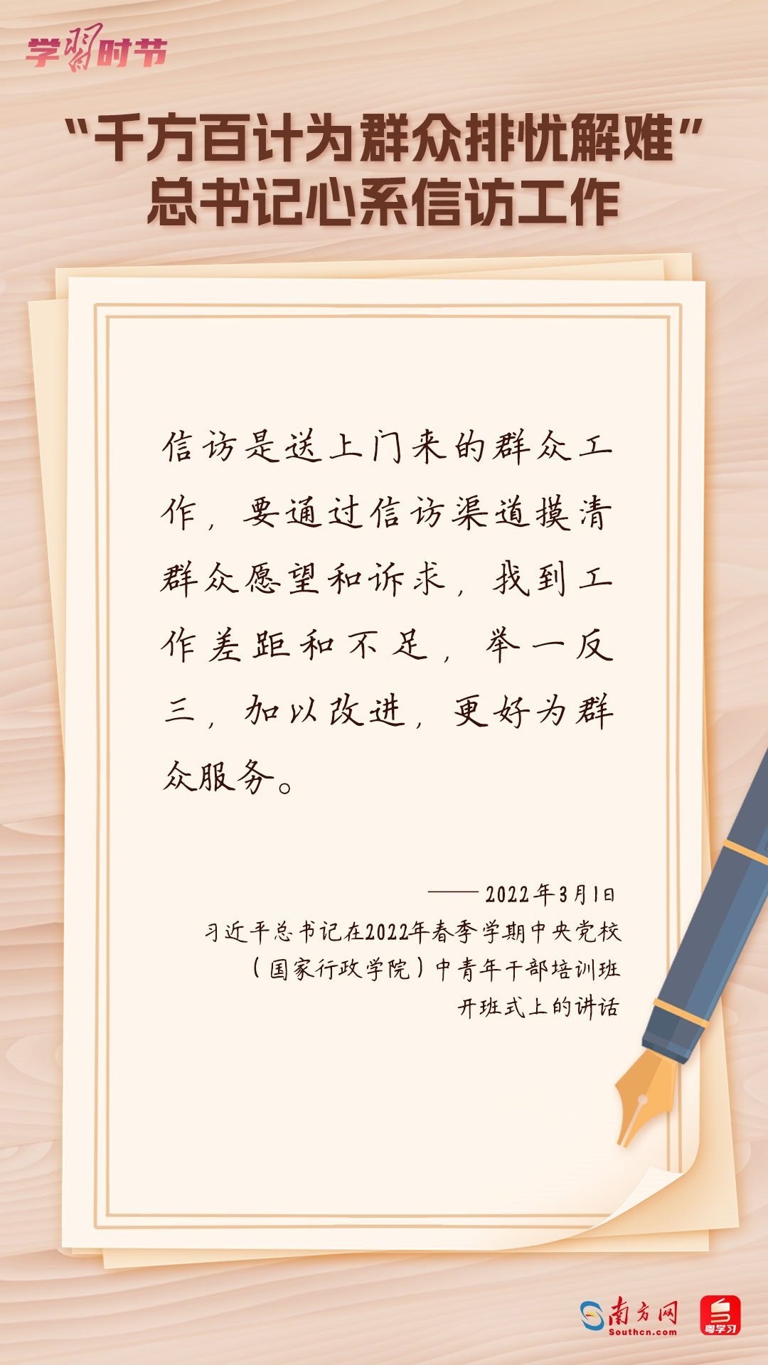 2022年5月1日,中共中央、國(guó)務(wù)院印發(fā)的《信訪工作條例》正式實(shí)施?!缎旁L工作條例》以習(xí)近平新時(shí)代中國(guó)特色社會(huì)主義思想為指導(dǎo),深入貫徹習(xí)近平總書記關(guān)于加強(qiáng)和改進(jìn)人民信訪工作的重要思想,總結(jié)黨長(zhǎng)期以來(lái)領(lǐng)導(dǎo)和開(kāi)展信訪工作經(jīng)驗(yàn)特別是黨的十八大以來(lái)信訪工作制度改革成果,堅(jiān)持和加強(qiáng)黨對(duì)信訪工作的全面領(lǐng)導(dǎo),理順信訪工作體制機(jī)制,是新時(shí)代信訪工作的基本遵循。今年5月1日是《信訪工作條例》實(shí)施一周年,“學(xué)習(xí)時(shí)節(jié)”整理摘錄習(xí)近平總書記關(guān)于信訪工作的重要講話和重要指示批示,與您一同學(xué)習(xí)。