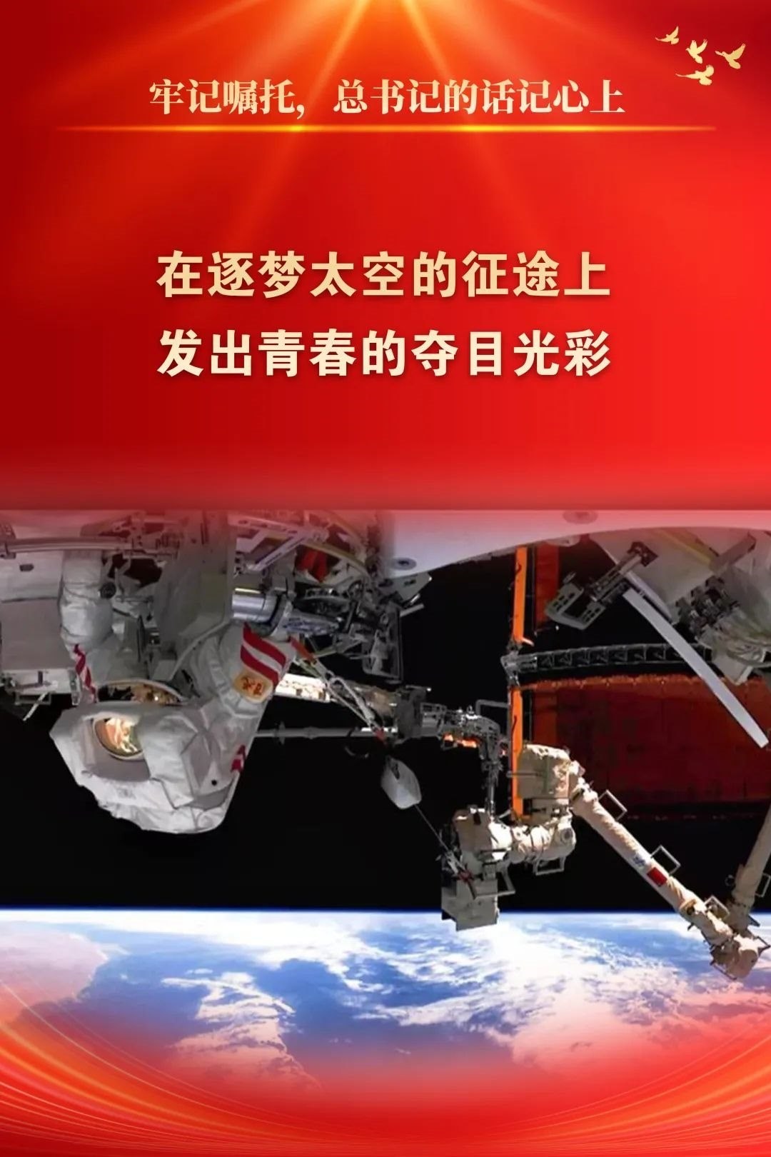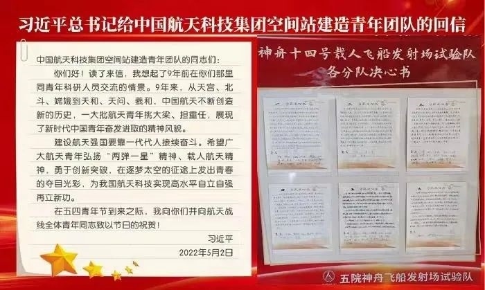 2022年5月2日,習(xí)近平總書記給中國航天科技集團(tuán)空間站建造青年團(tuán)隊回信,高度肯定航天青年,殷切期待青春奮斗。他強調(diào):“希望廣大航天青年弘揚‘兩彈一星’精神、載人航天精神,勇于創(chuàng)新突破,在逐夢太空的征途上發(fā)出青春的奪目光彩,為我國航天科技實現(xiàn)高水平自立自強再立新功?!币荒陙?,五院人持續(xù)學(xué)習(xí)重溫、堅決貫徹落實習(xí)近平總書記重要回信精神和關(guān)于航天強國建設(shè)的重要指示批示精神,始終做到牢記囑托、感恩奮進(jìn),交出非凡“答卷”。