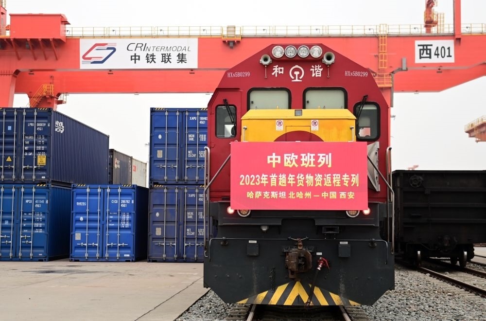 滿載著來自哈薩克斯坦1300噸面粉的中歐班列抵達(dá)西安國際港站(1月13日攝)。新華社記者 李一博 攝