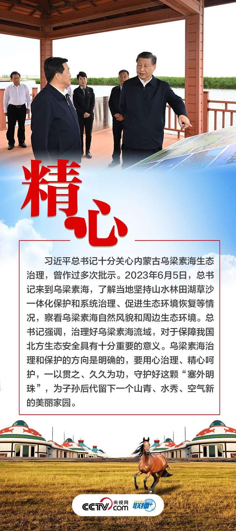 6月5日至6日,習(xí)近平總書記深入內(nèi)蒙古巴彥淖爾市的自然保護區(qū)、現(xiàn)代農(nóng)業(yè)示范園區(qū)、林場、水利部門等調(diào)研。黨的十八大以來,三次到內(nèi)蒙古考察、五次參加內(nèi)蒙古代表團審議,傳遞著習(xí)近平總書記對這片熱土的牽掛與惦念。央視網(wǎng)《聯(lián)播+》梳理總書記與內(nèi)蒙古的故事,與您一起體會這些故事背后的“心”意。