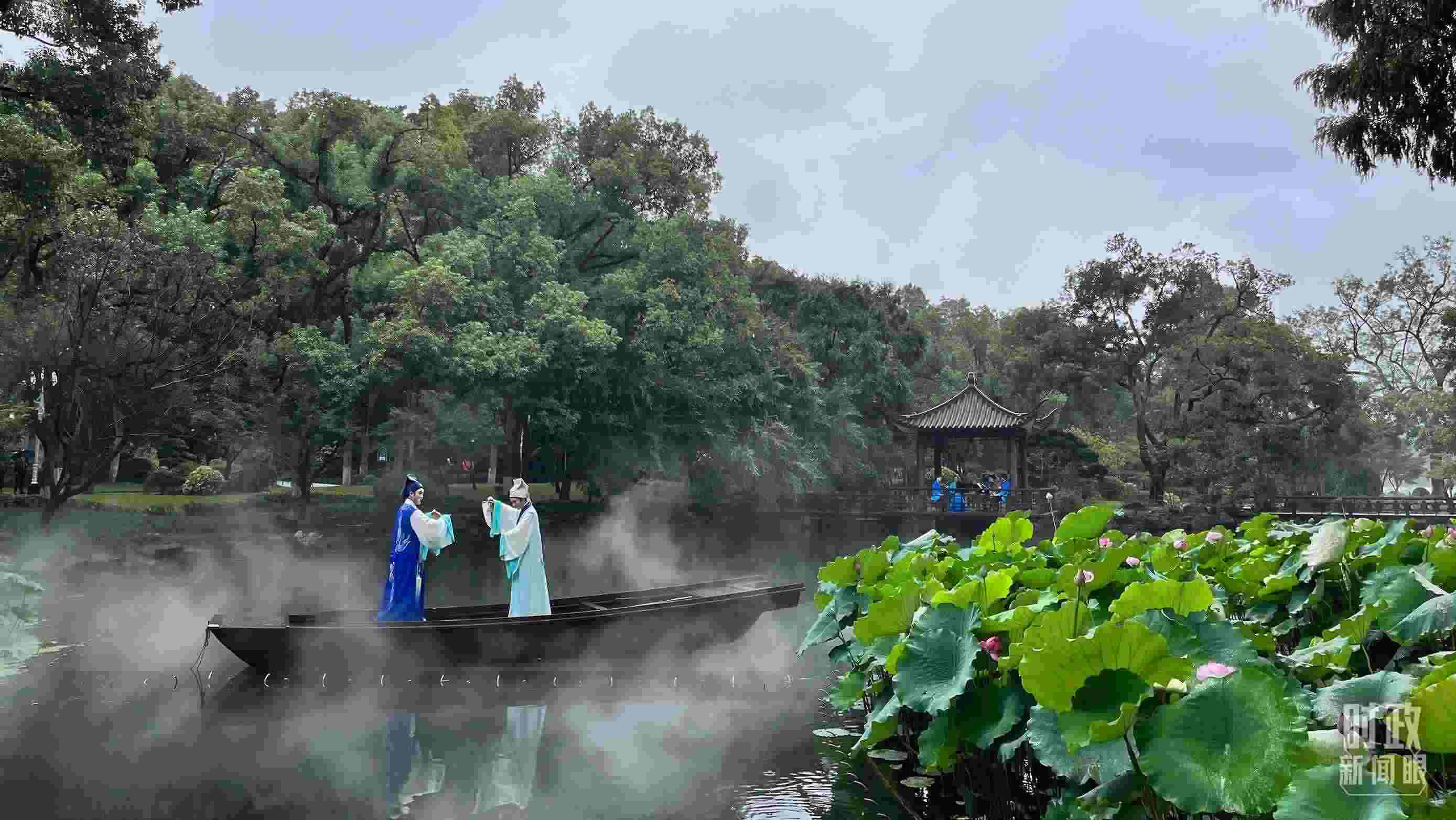 沿著湖畔長廊,漫步至漪園宴會廳,沿途可以欣賞浙江小百花越劇院青年演員表演的越劇經(jīng)典劇目《梁?!愤x段《十八相送》。