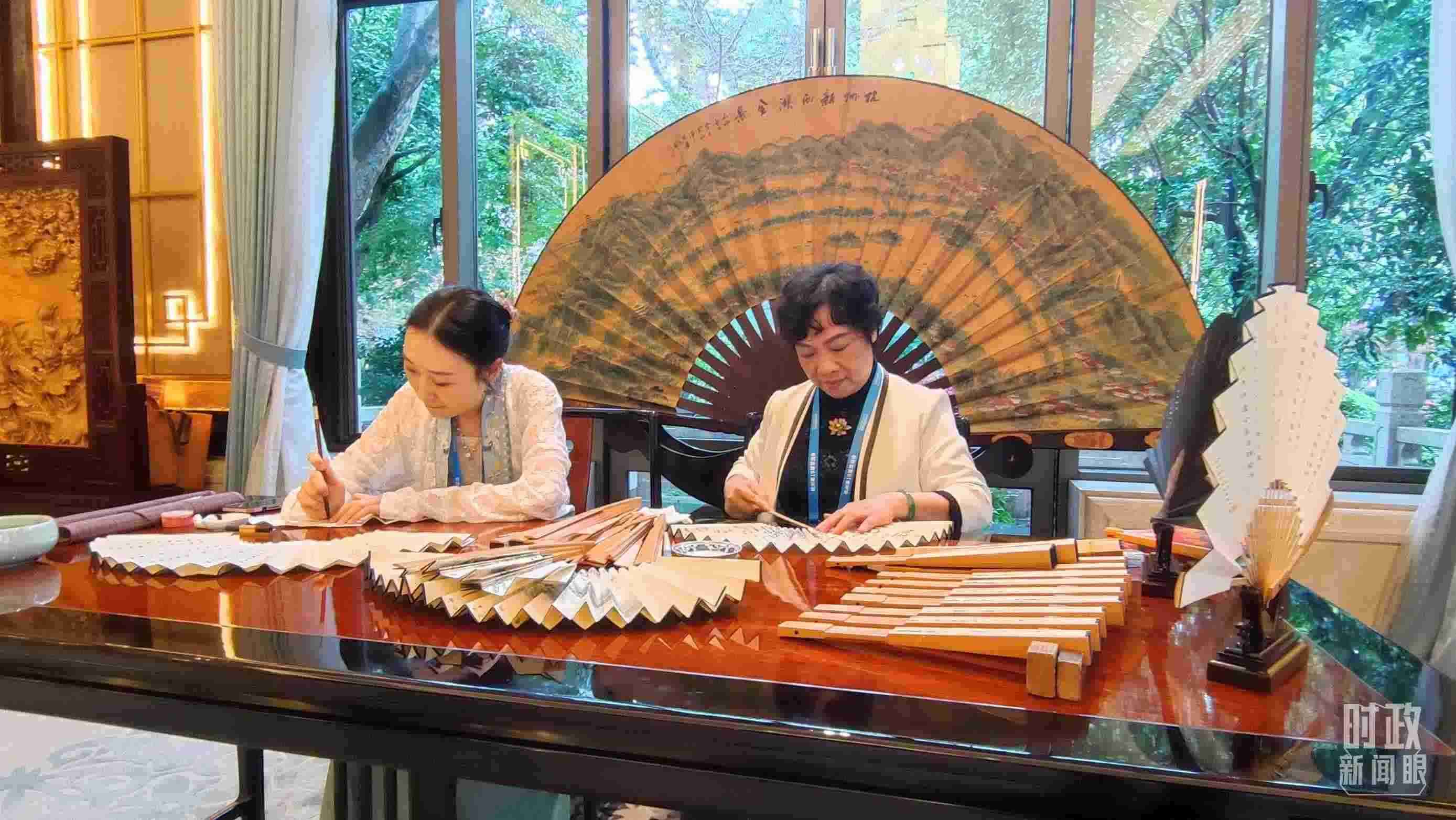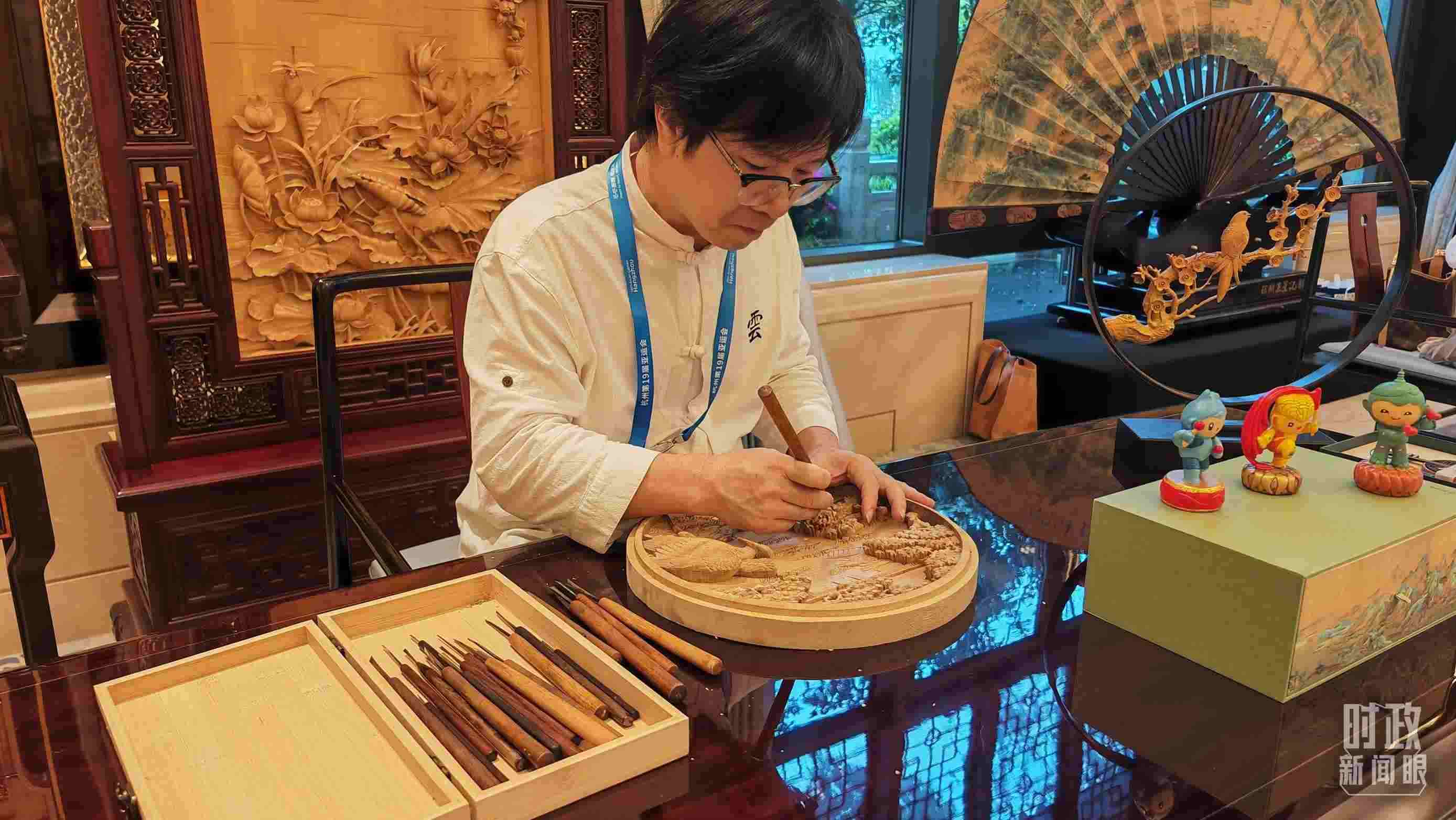 宴會廳外,東陽木雕、杭州刺繡、王星記扇等浙江非物質(zhì)文化遺產(chǎn)展示,吸引貴賓們流連駐足。