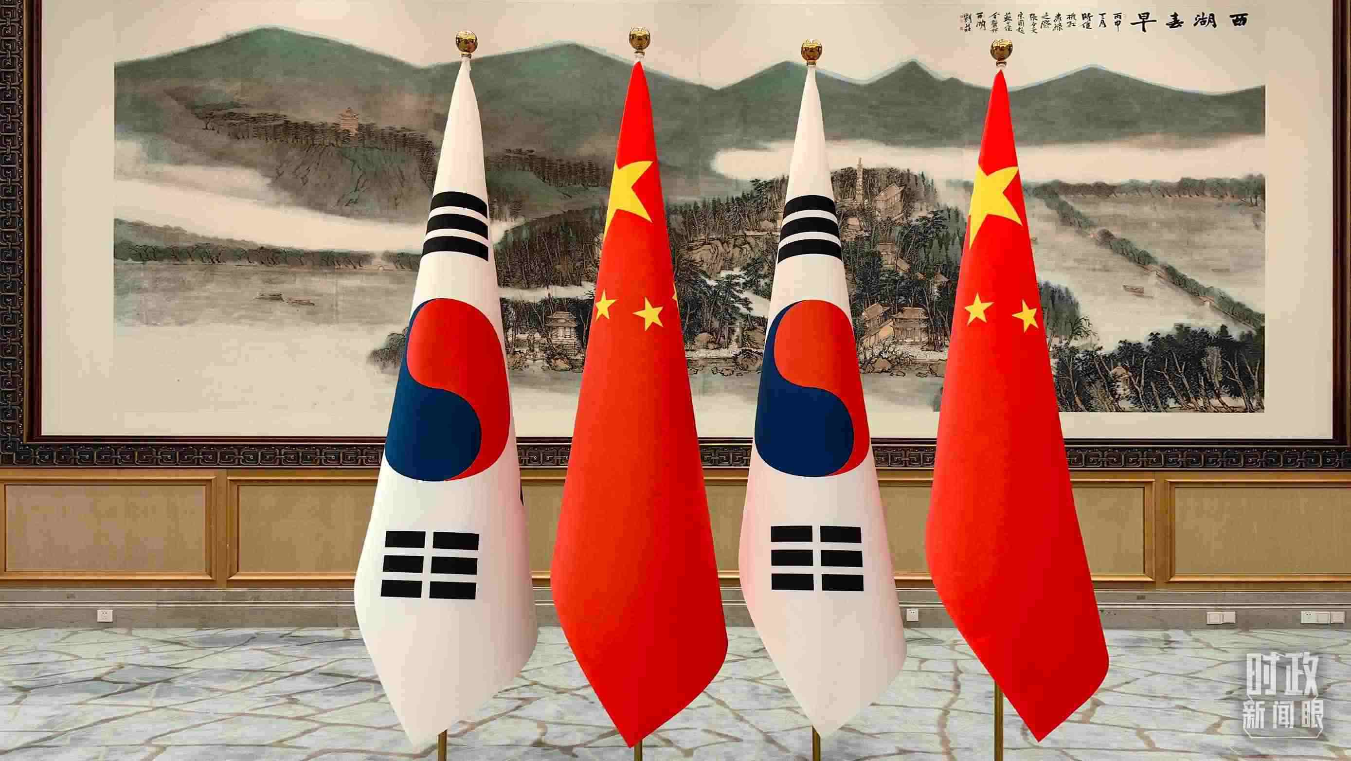 △會見現(xiàn)場擺放的中國、韓國國旗。(總臺央廣記者潘毅拍攝)