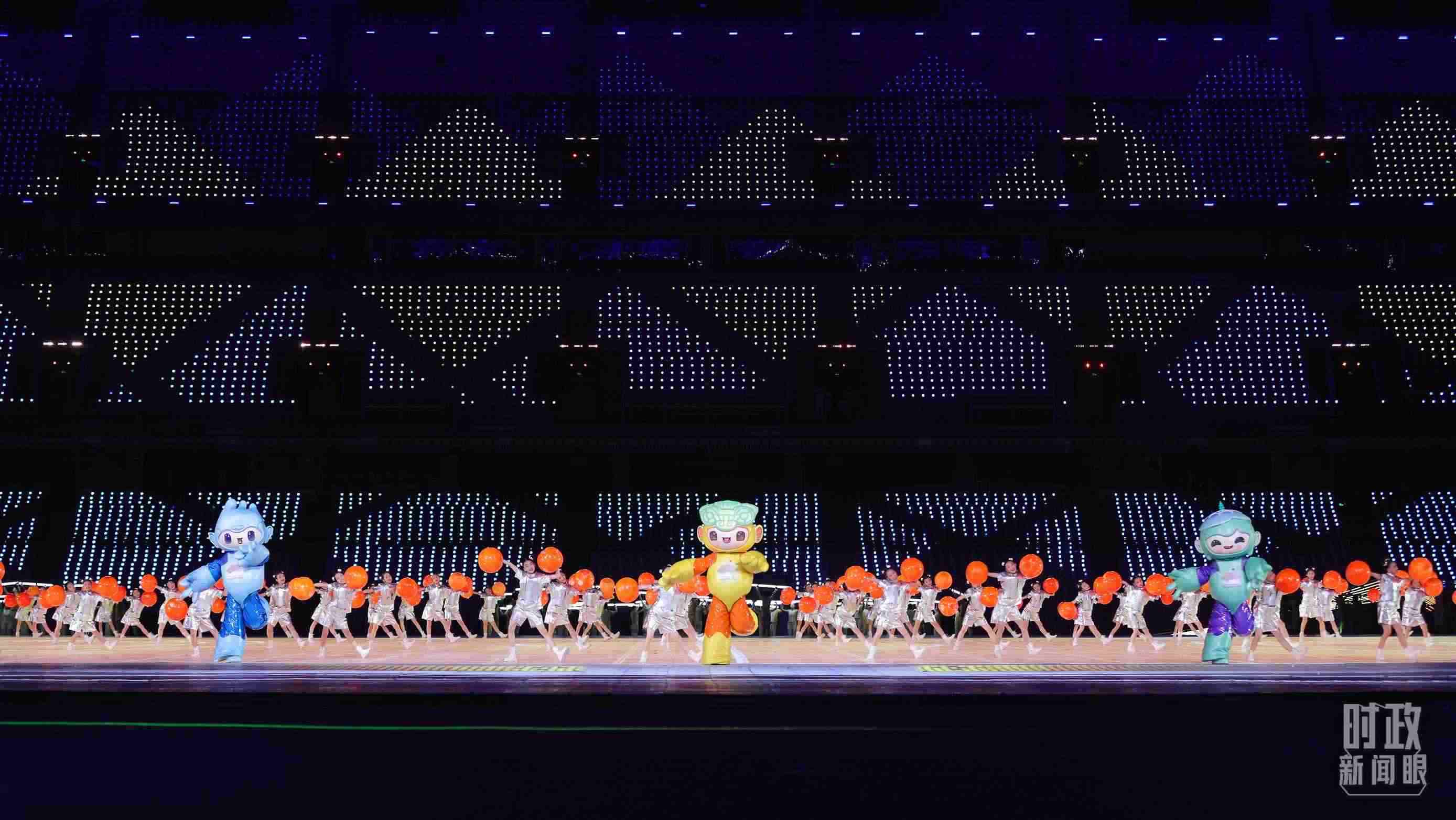 △開幕式文藝表演中的亞運會吉祥物。(總臺央視記者魏幫軍拍攝)