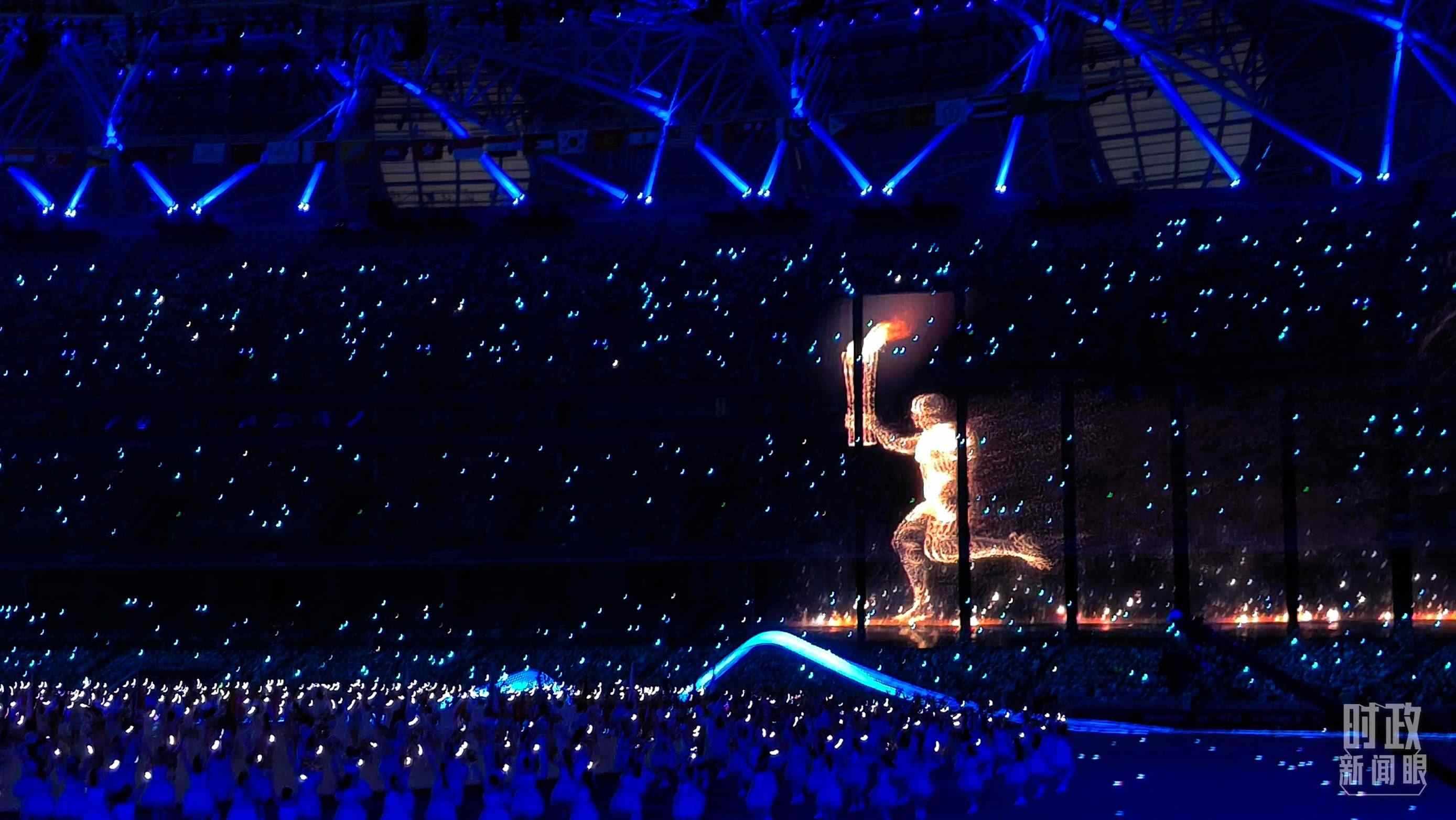 △“數(shù)字火炬手”入場,與現(xiàn)場火炬手共同點燃主火炬。(總臺央視記者王子杭、總臺國廣記者李晉拍攝)