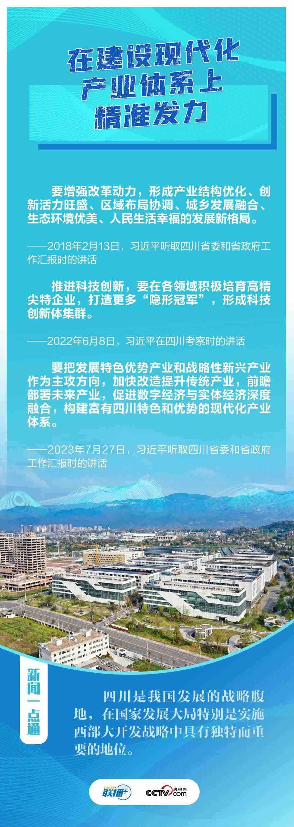 “希望四川在推進(jìn)科技創(chuàng)新和科技成果轉(zhuǎn)化上同時(shí)發(fā)力,在建設(shè)現(xiàn)代化產(chǎn)業(yè)體系上精準(zhǔn)發(fā)力,在推進(jìn)鄉(xiāng)村振興上全面發(fā)力,在筑牢長(zhǎng)江黃河上游生態(tài)屏障上持續(xù)發(fā)力?!?月27日,在巴蜀大地考察的習(xí)近平總書(shū)記聽(tīng)取四川省委和省政府工作匯報(bào),對(duì)四川各項(xiàng)工作提出新寄望。