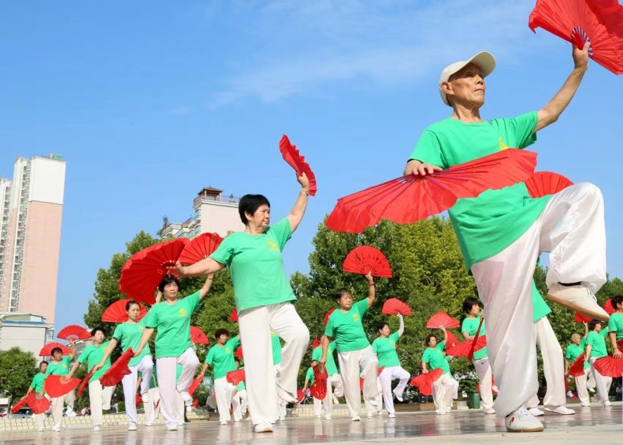 △2022年8月8日,在河南洛陽市汝陽縣,健身愛好者在表演太極蓮花雙扇。