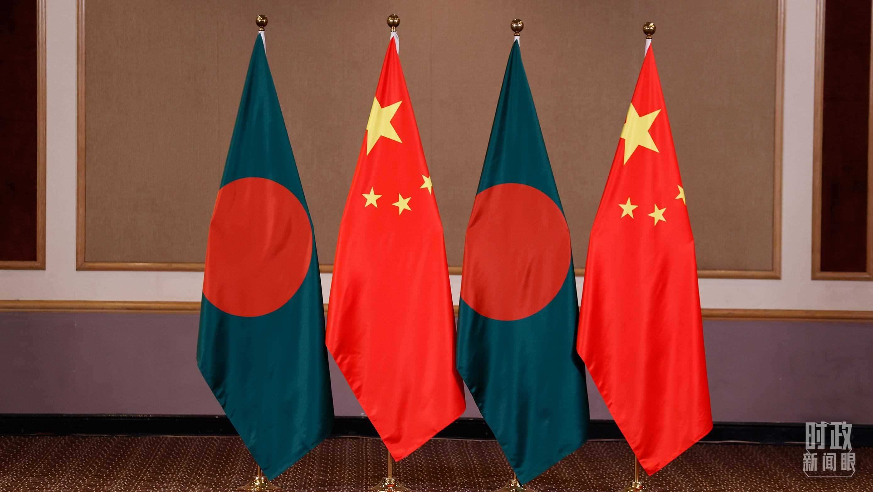 △會(huì)見現(xiàn)場(chǎng)的中孟兩國(guó)國(guó)旗。(總臺(tái)央視記者耿小龍拍攝)