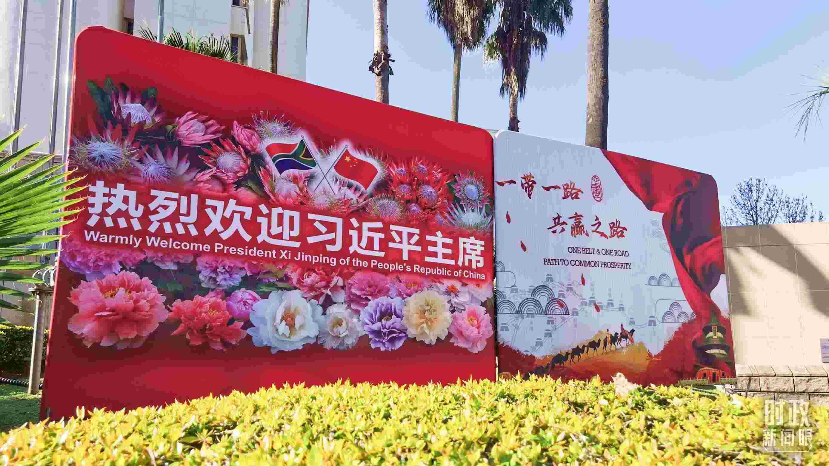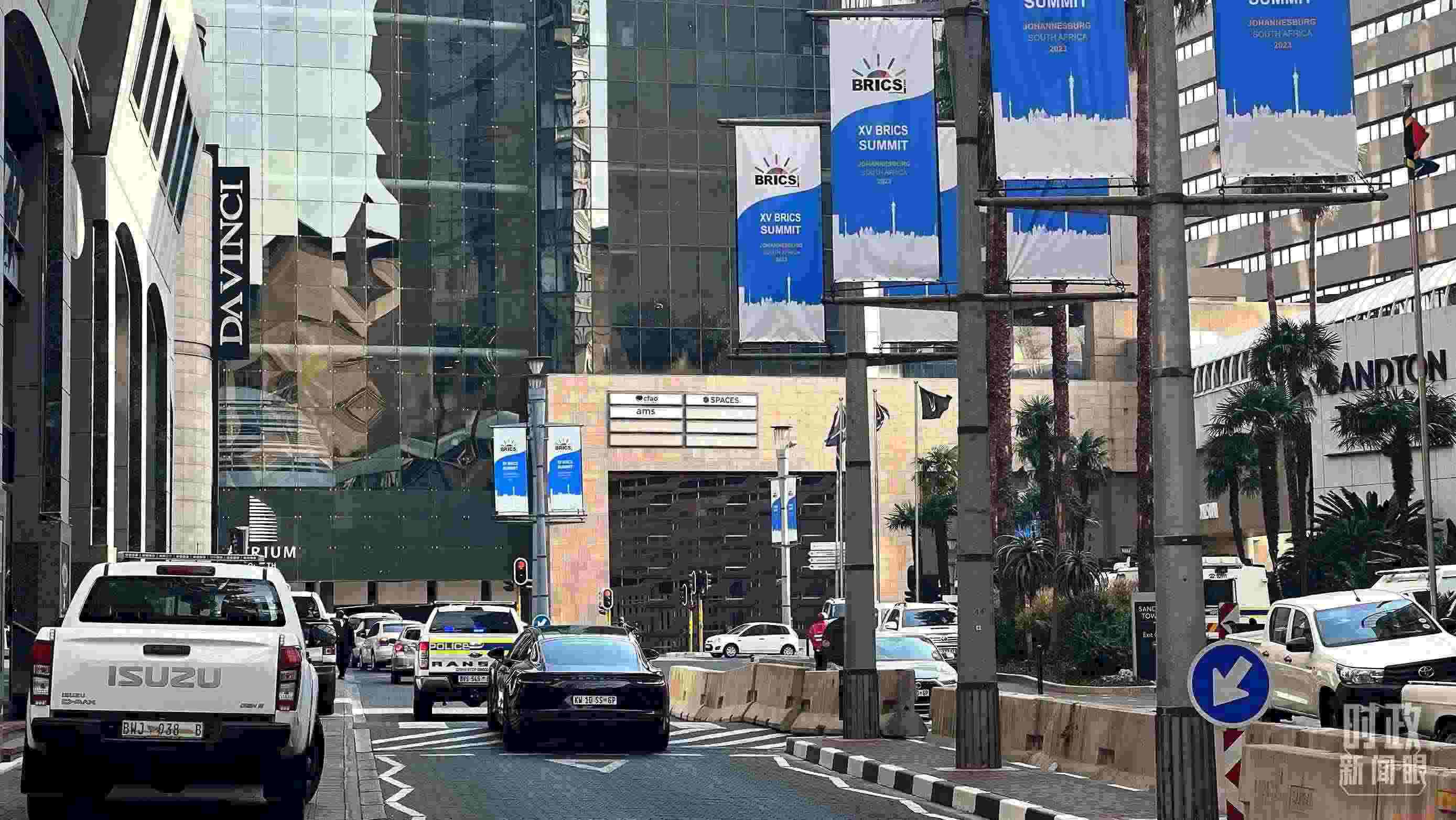 △約翰內(nèi)斯堡街道兩側(cè)懸掛的中國(guó)國(guó)旗。(總臺(tái)央視記者韓銳拍攝)
