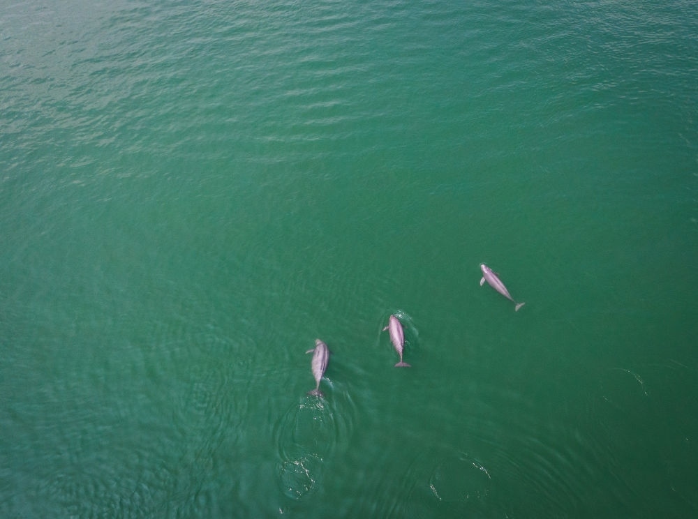 這是2021年5月11日在湖北省宜昌市拍攝的在水中嬉戲的長江江豚(無人機(jī)照片)。新華社記者 肖藝九 攝