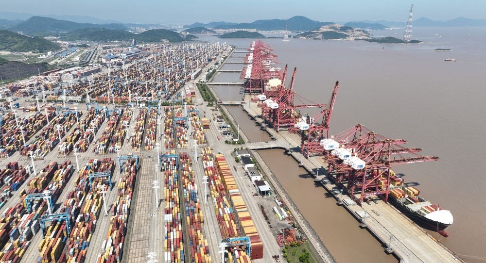 貨輪??吭趯幉ㄖ凵礁鄞┥礁蹍^(qū)裝卸貨物(2023年5月9日攝,無人機(jī)照片)。新華社記者 翁忻旸 攝