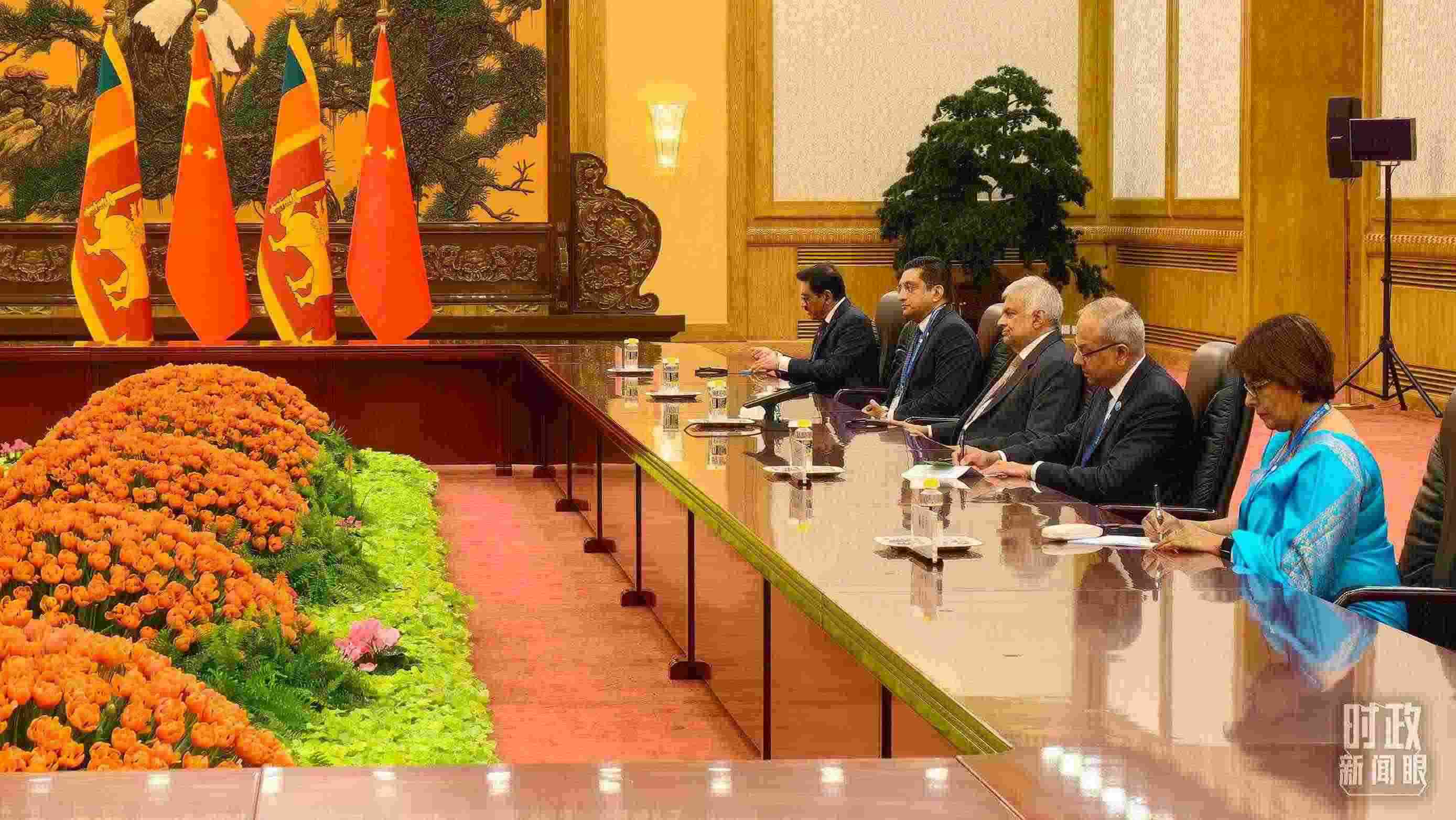 △會見現(xiàn)場擺放的中國、斯里蘭卡國旗。(總臺央視記者范一鳴拍攝)