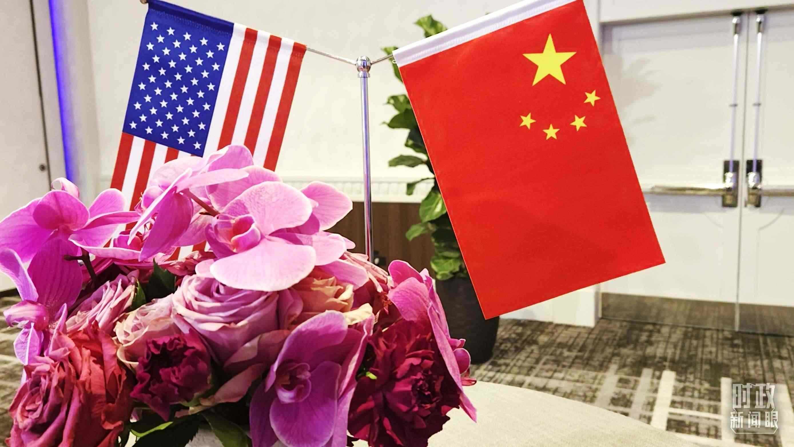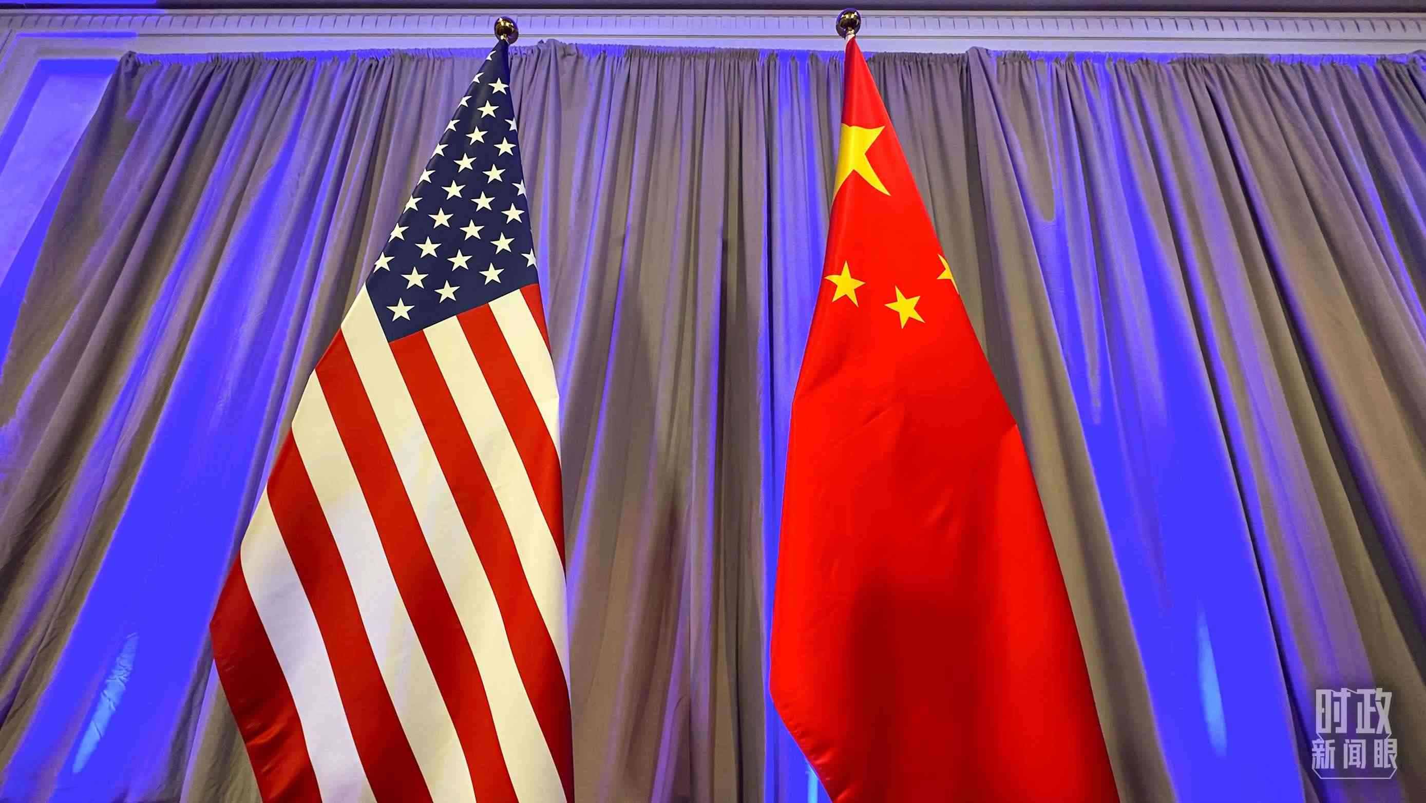 歡迎宴會(huì)現(xiàn)場(chǎng)的中美兩國(guó)國(guó)旗。(總臺(tái)央視記者范一鳴拍攝)