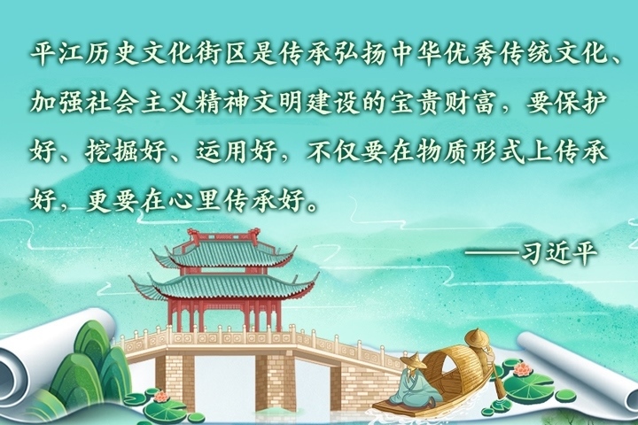 2023年7月6日上午,習(xí)近平總書記來到位于蘇州古城東北隅的平江歷史文化街區(qū)考察調(diào)研。他說:“住在這里很有福氣,古色古香,到處都是古跡、到處都是名勝、到處都是文化。‘百步之內(nèi),必有芳草’,這句話可以用在這里?!?/p>