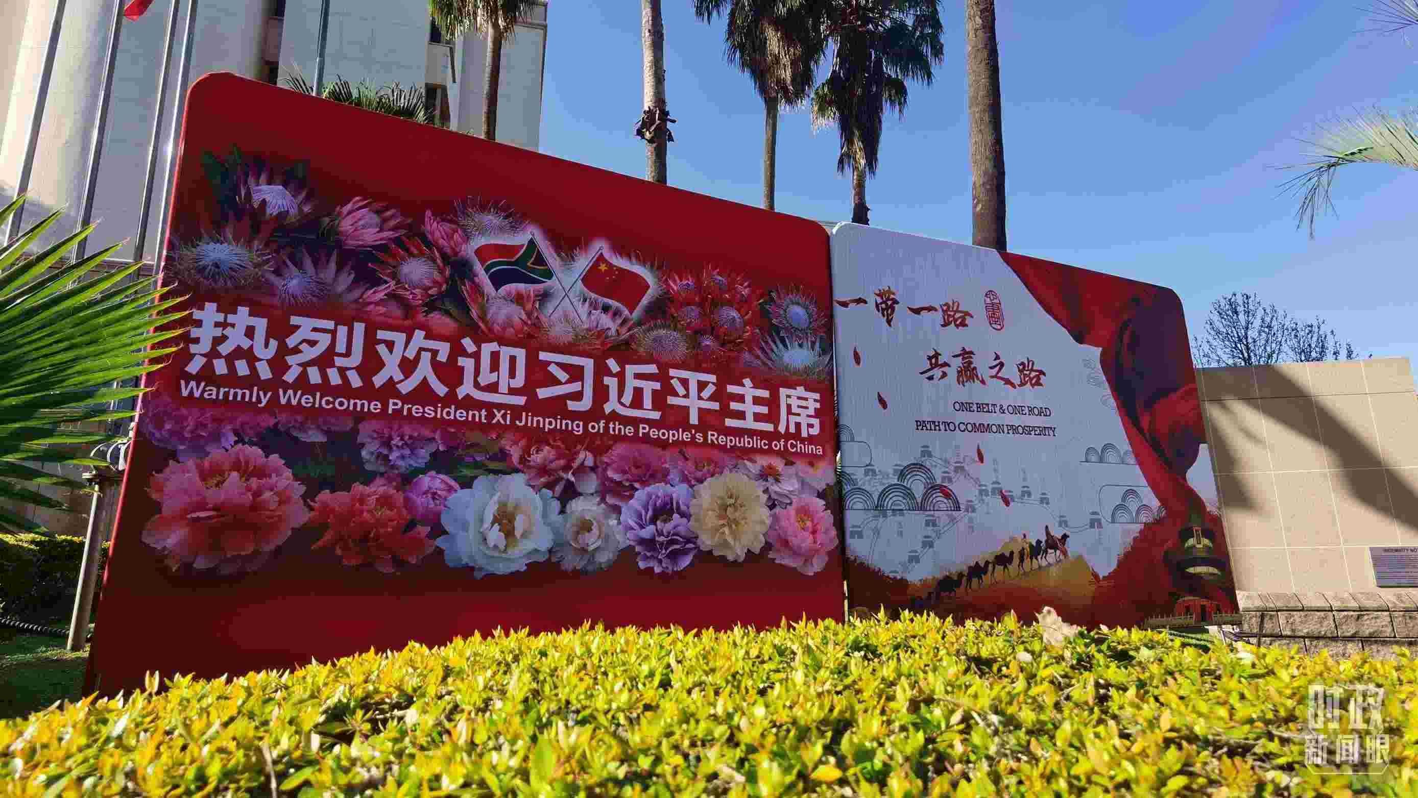 △ 2023年8月,習(xí)近平主席抵達(dá)南非約翰內(nèi)斯堡,出席金磚國家領(lǐng)導(dǎo)人第十五次會晤并對南非進(jìn)行國事訪問。圖為約翰內(nèi)斯堡街道邊“熱烈歡迎習(xí)近平主席”的標(biāo)語牌。(總臺央視記者曹亞星拍攝)