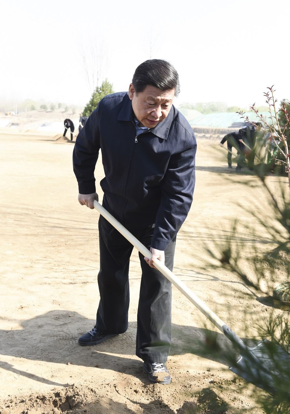 2014年4月4日,習(xí)近平等黨和國(guó)家領(lǐng)導(dǎo)人來(lái)到北京市海淀區(qū)南水北調(diào)團(tuán)城湖調(diào)節(jié)池參加首都義務(wù)植樹(shù)活動(dòng)。這是習(xí)近平在植樹(shù)。