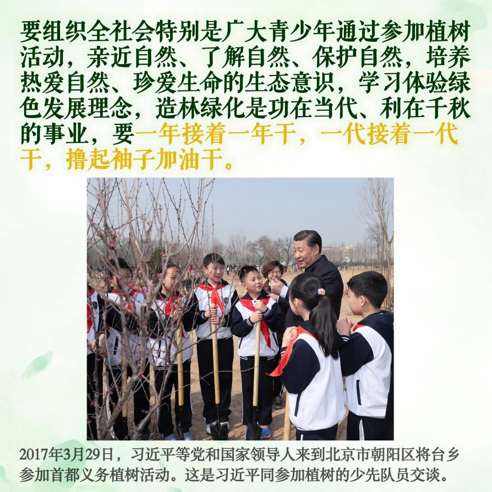 十年樹(shù)木,百年樹(shù)人。除去2020年因疫情防控考慮,每年植樹(shù)時(shí),習(xí)總書記都要和少年兒童一起,培土澆水、談心交流。好好學(xué)習(xí),鍛煉身體,熱愛(ài)勞動(dòng),愛(ài)護(hù)環(huán)境,德智體美勞全面發(fā)展,長(zhǎng)大后成為建設(shè)祖國(guó)的棟梁之才……習(xí)爺爺?shù)囊笠髧谕泻拖<?,激?lì)著新時(shí)代少年兒童奮發(fā)有為、向陽(yáng)成長(zhǎng)。