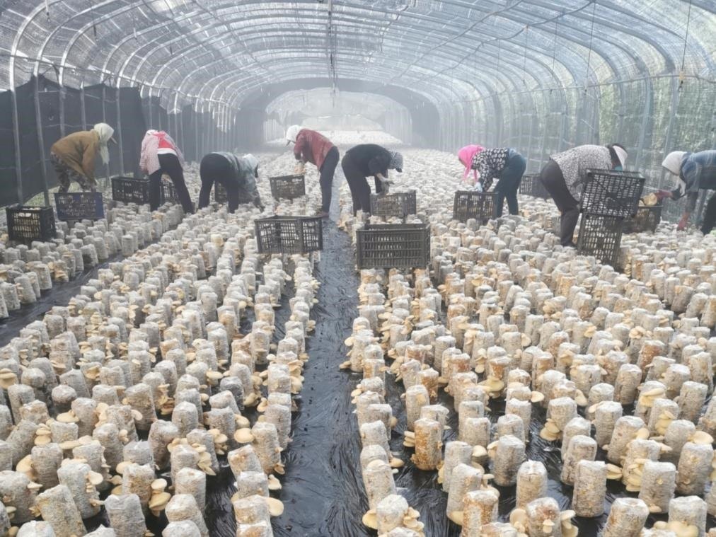 村民在喀喇沁旗雙澤食用菌有限公司的溫棚里采摘元蘑。(受訪者供圖)