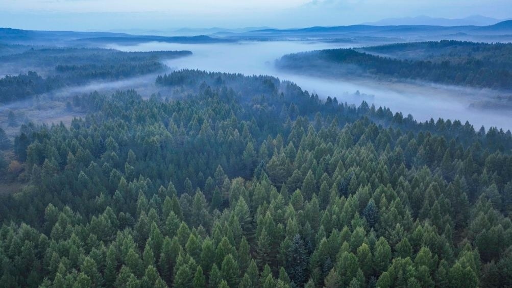 青霧繚繞的塞罕壩(無(wú)人機(jī)照片,2023年9月9日攝)。新華社發(fā)(劉滿倉(cāng)攝)