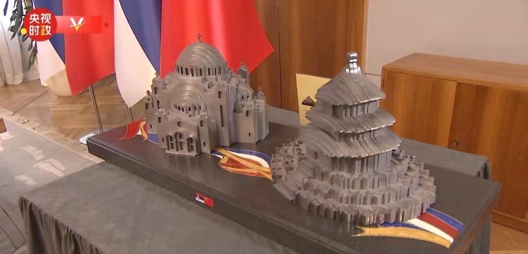 這份禮物是北京天壇和貝爾格萊德圣薩瓦教堂造型的鋼制工藝品,由中國河鋼集團(tuán)斯梅戴雷沃鋼廠生產(chǎn)的鋼材制成。望著這份禮物,習(xí)主席風(fēng)趣地說,是“鋼桿”朋友了。