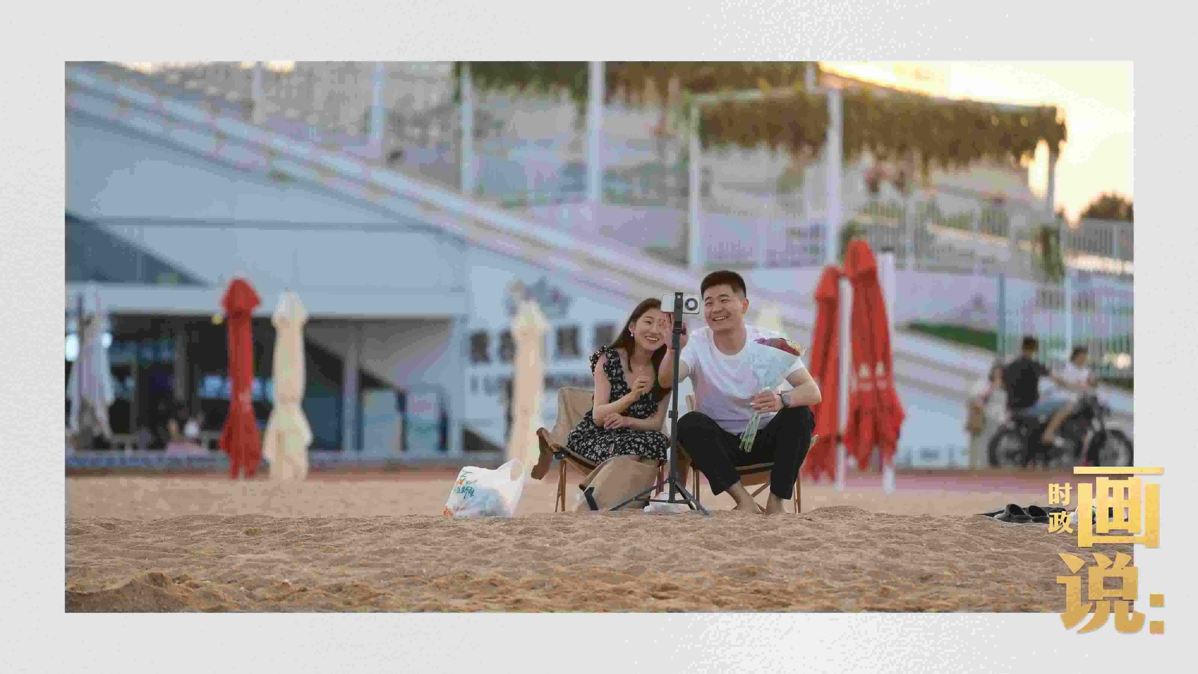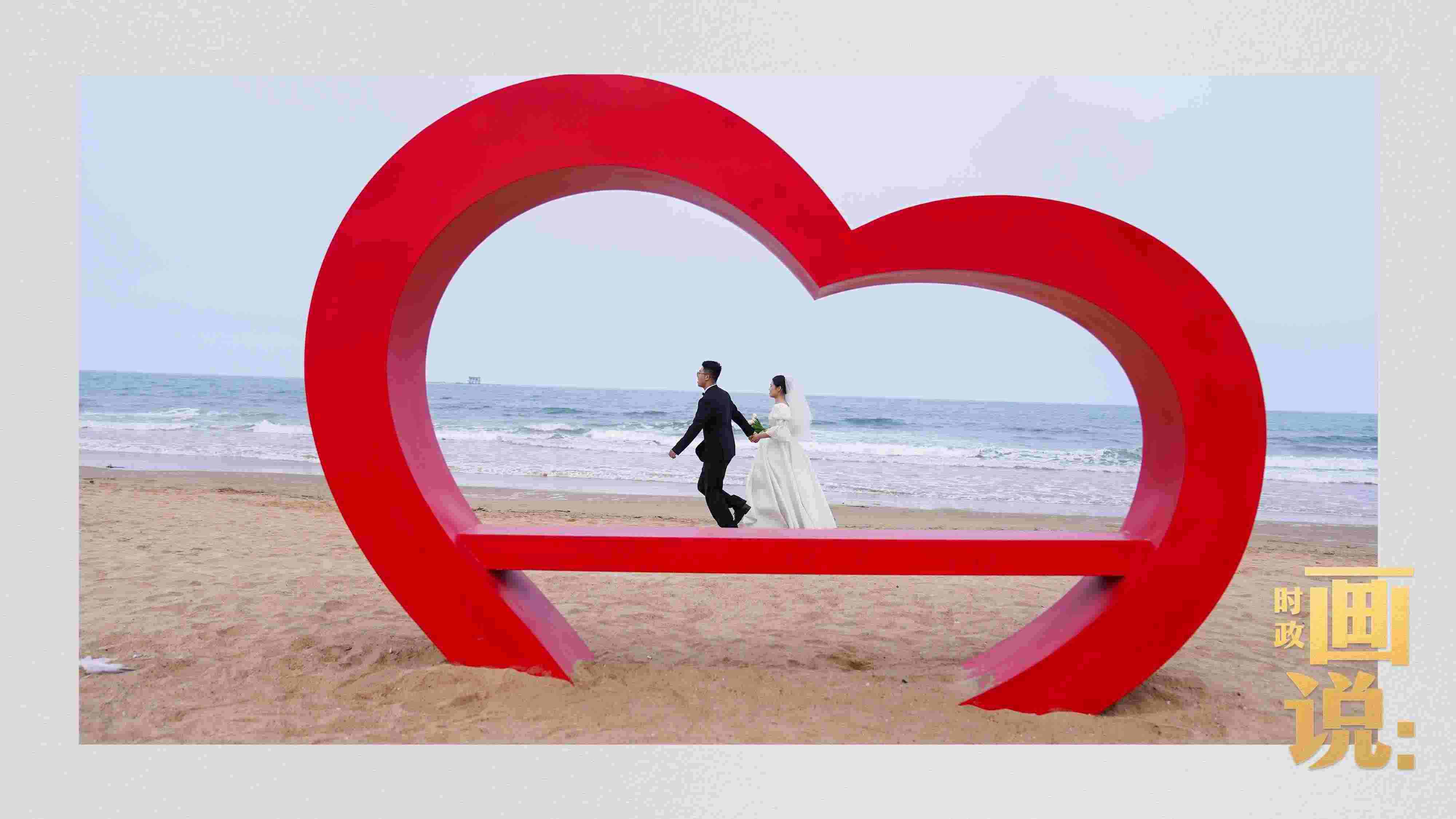 △日照陽光海岸綠道上的萬平口景區(qū),一對游客在海浪中翩然起舞。