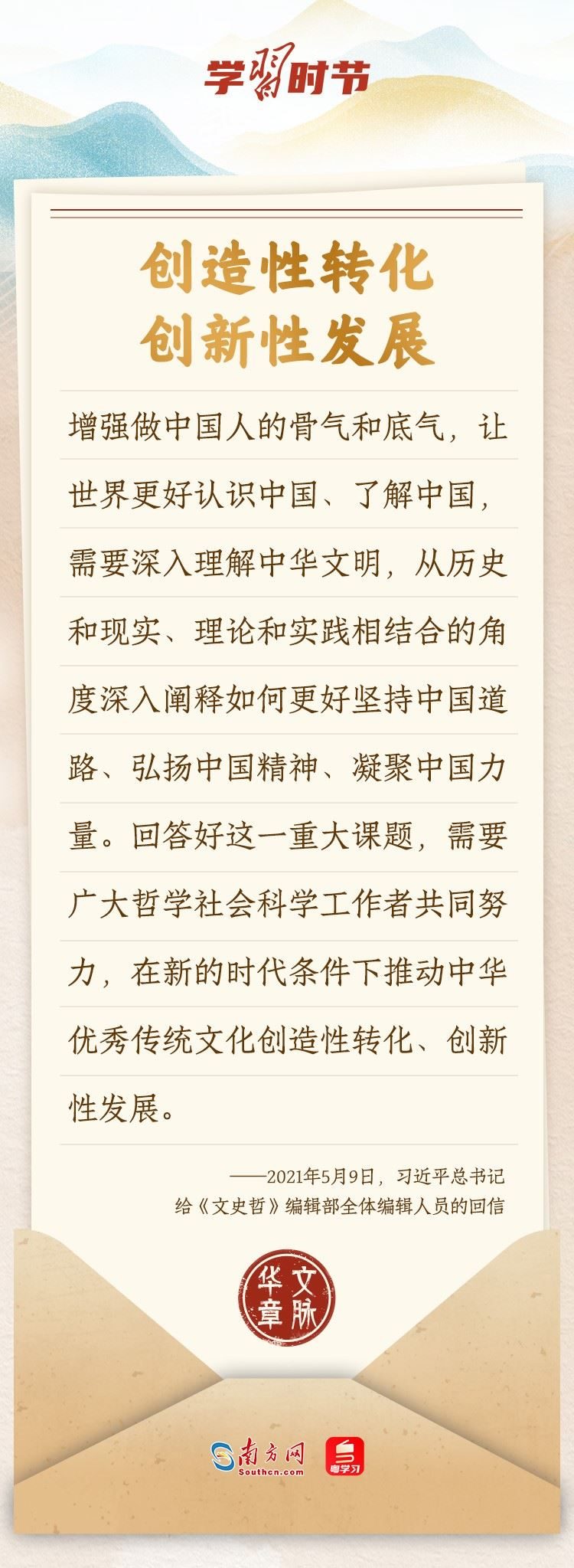 “中華民族在幾千年歷史中創(chuàng)造和延續(xù)的中華優(yōu)秀傳統(tǒng)文化,是中華民族的根和魂?!绷?xí)近平總書記多次通過發(fā)賀信、寫回信等方式,表達著對弘揚中華優(yōu)秀傳統(tǒng)文化的殷切希望,飽含深情、字字暖心、催人奮進。讓我們一起“讀”信。