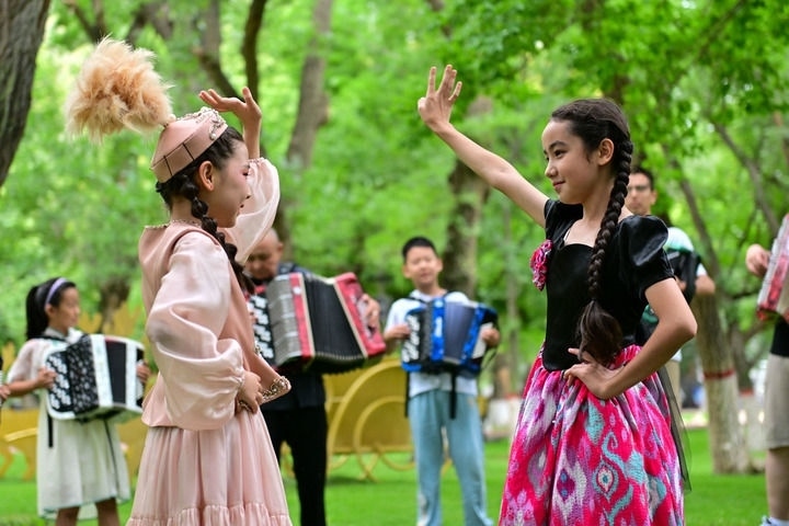 在新疆塔城市文化廣場,練習(xí)手風(fēng)琴的孩子隨著琴聲翩翩起舞(2024年7月24日攝)。新華社記者 丁磊 攝