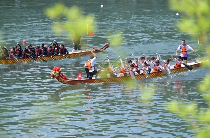 2024年8月10日,湖北省恩施土家族苗族自治州宣恩縣城區(qū)貢水河上,選手在第十二屆全國少數(shù)民族傳統(tǒng)體育運(yùn)動會“同心暢享”系列活動——全國龍舟邀請賽200米直道賽預(yù)賽中。新華社發(fā)(宋文攝)