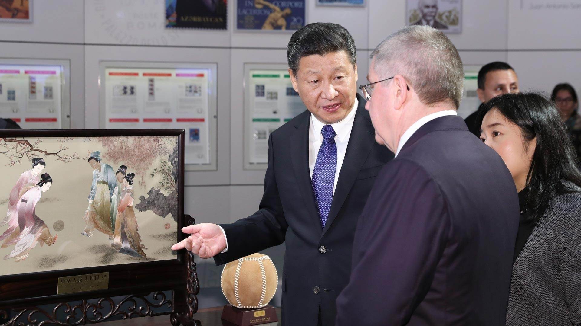2017年1月,習(xí)近平主席在訪問瑞士期間專程來到坐落在洛桑半山腰的國際奧林匹克博物館。這是中國國家元首首次到訪。習(xí)近平主席代表中國向國際奧委會贈送了蘇繡《仕女蹴鞠圖》,并在留言簿上用中文寫下:“弘揚(yáng)奧運(yùn)精神,促進(jìn)和平發(fā)展”。