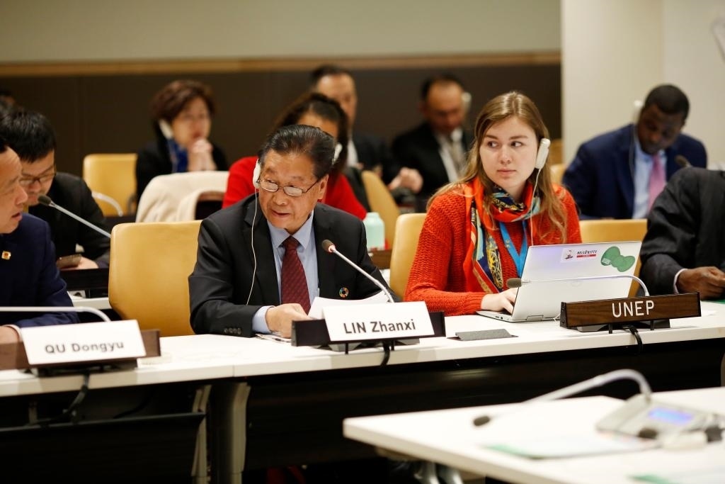 2019年4月18日,在位于紐約的聯(lián)合國總部,林占熺(前排中)在“菌草技術(shù):‘一帶一路’倡議對促進(jìn)落實聯(lián)合國2030年可持續(xù)發(fā)展議程的實質(zhì)性貢獻(xiàn)”專題研討會上發(fā)言。新華社記者 李木子 攝