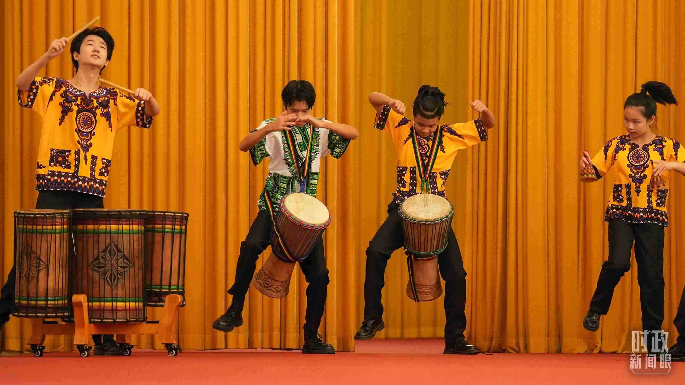 在前往宴會廳沿途,身著中國民族服裝和非洲特色服裝的青少年,打起歡快的非洲鼓,載歌載舞歡迎遠道而來的貴賓。