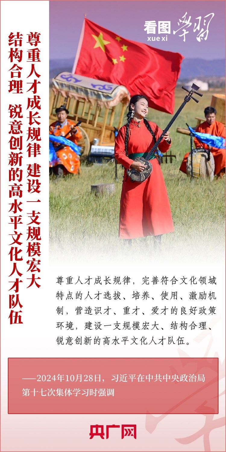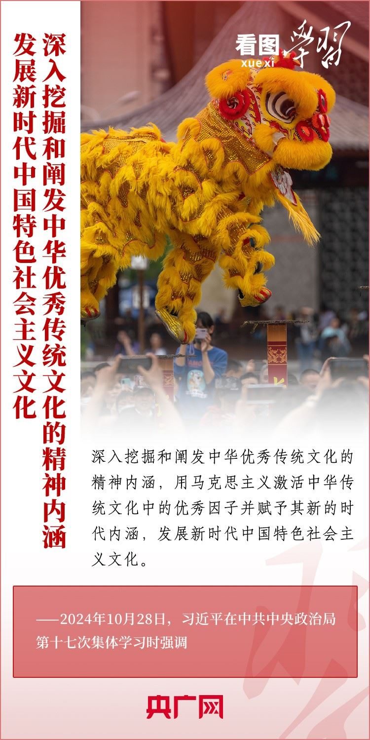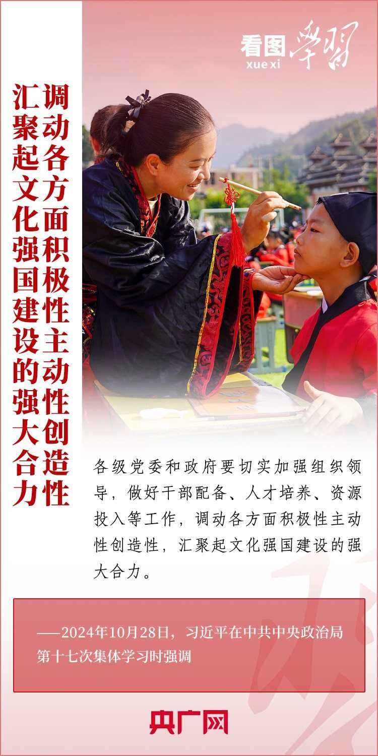 建設(shè)文化強(qiáng)國(guó)是全黨全社會(huì)的共同任務(wù)。10月28日,中共中央政治局就建設(shè)文化強(qiáng)國(guó)進(jìn)行第十七次集體學(xué)習(xí)。習(xí)近平總書記在聽(tīng)取講解和討論后發(fā)表重要講話,就錨定2035年建成文化強(qiáng)國(guó)戰(zhàn)略目標(biāo)作出最新部署,強(qiáng)調(diào)要“不斷發(fā)展具有強(qiáng)大思想引領(lǐng)力、精神凝聚力、價(jià)值感召力、國(guó)際影響力的新時(shí)代中國(guó)特色社會(huì)主義文化,不斷增強(qiáng)人民精神力量,筑牢強(qiáng)國(guó)建設(shè)、民族復(fù)興的文化根基。”一起來(lái)學(xué)習(xí)!