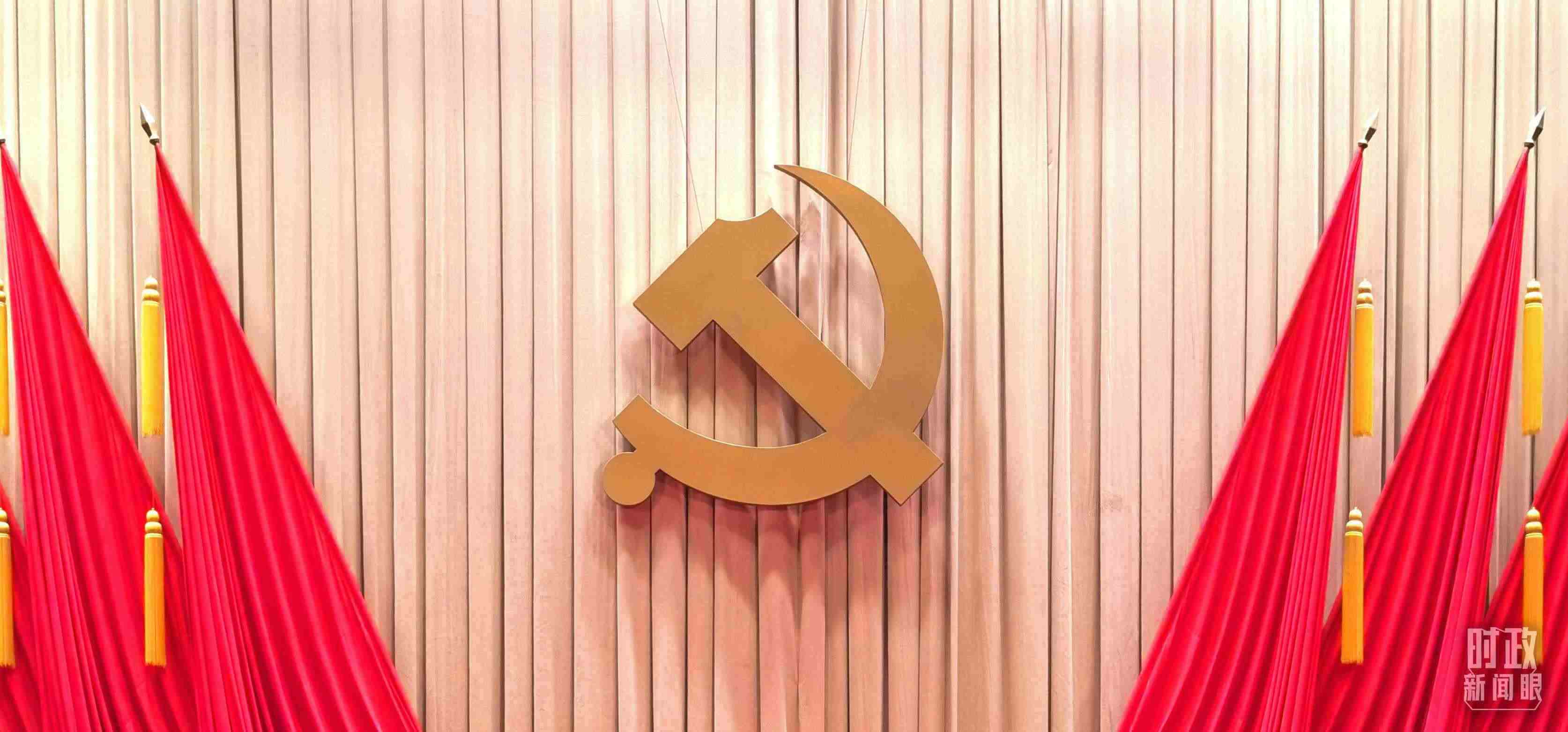 △省部級(jí)主要領(lǐng)導(dǎo)干部專題研討班開班式現(xiàn)場(chǎng)懸掛的黨徽。(總臺(tái)央視記者郭鴻拍攝)
