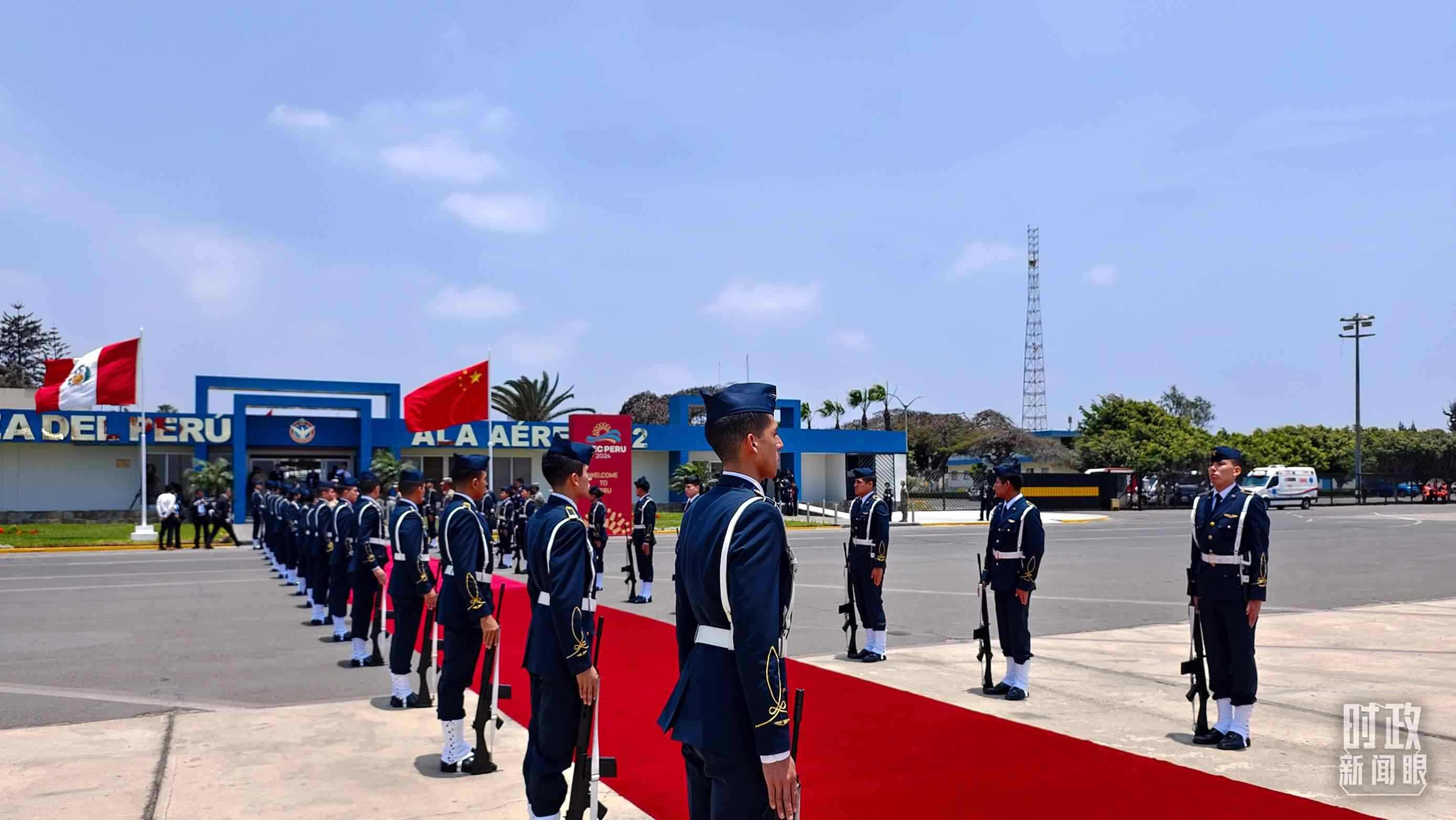 △利馬空軍基地,秘魯禮兵分列紅毯兩側(cè)迎接習主席到訪。(總臺央視記者韓銳拍攝)