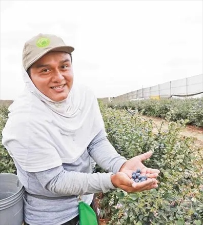 △在秘魯特魯希略市一家農(nóng)場里,采摘工人在展示剛摘下的藍莓。