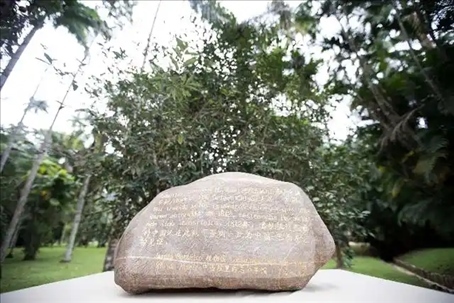 △巴西里約熱內(nèi)盧植物園,來自中國福建的華安石紀(jì)念牌記載:“1812年,首批抵達(dá)巴西的中國人在此栽下茶樹”。