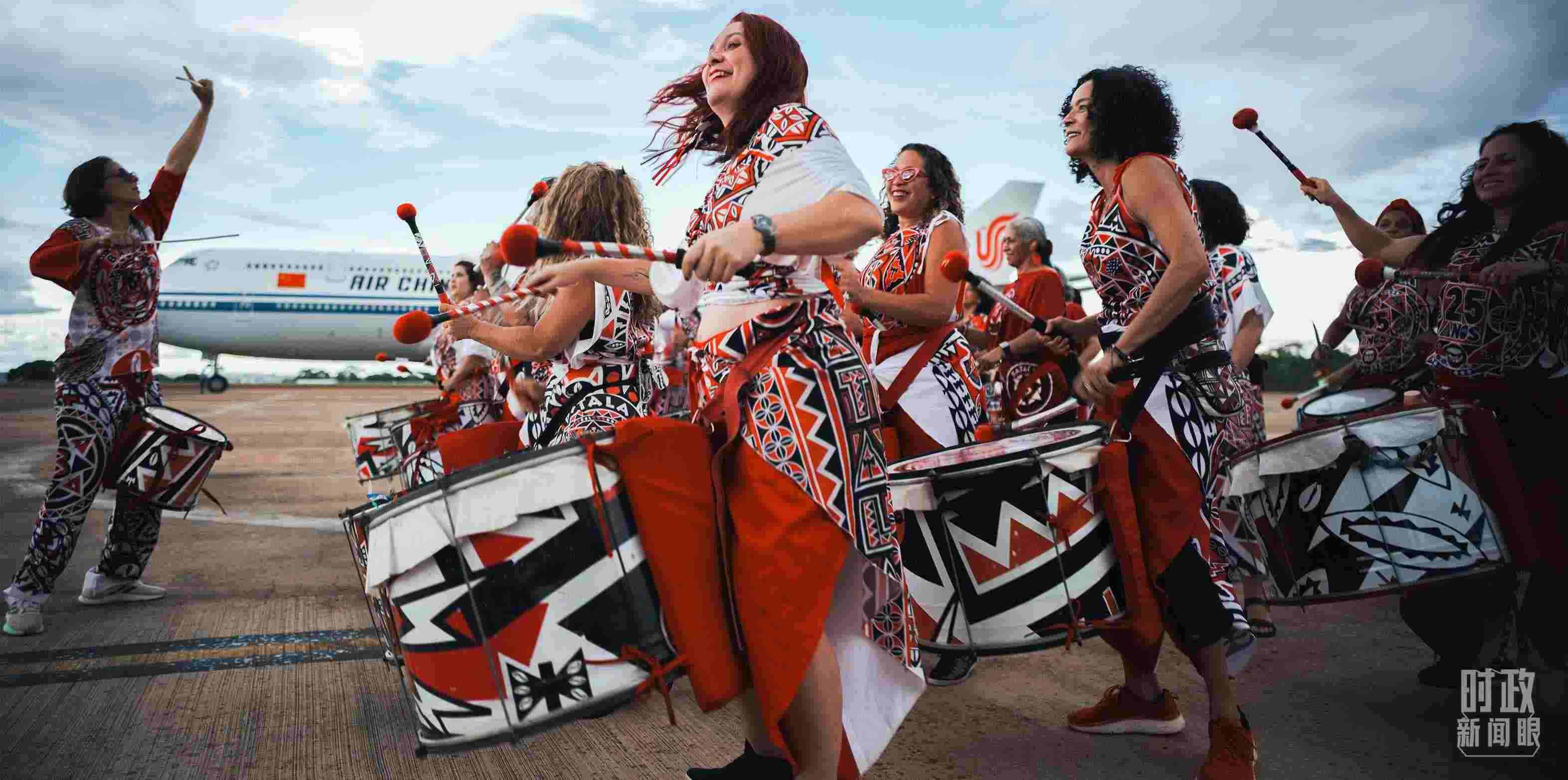 △習主席乘專機抵達巴西利亞,藝術家演奏特色鼓樂。(總臺央視記者彭漢明拍攝)