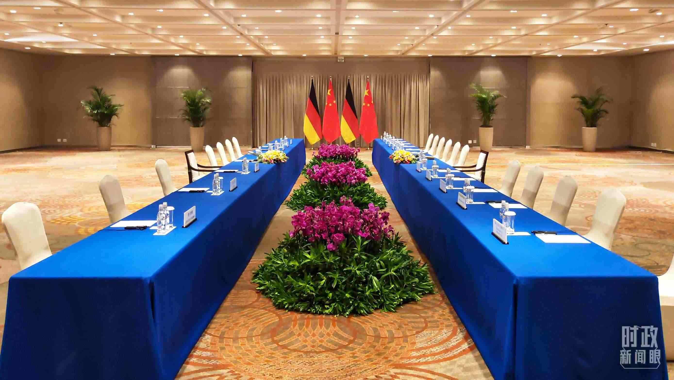△會見現(xiàn)場的中德兩國國旗。(總臺央視記者李增仁拍攝)