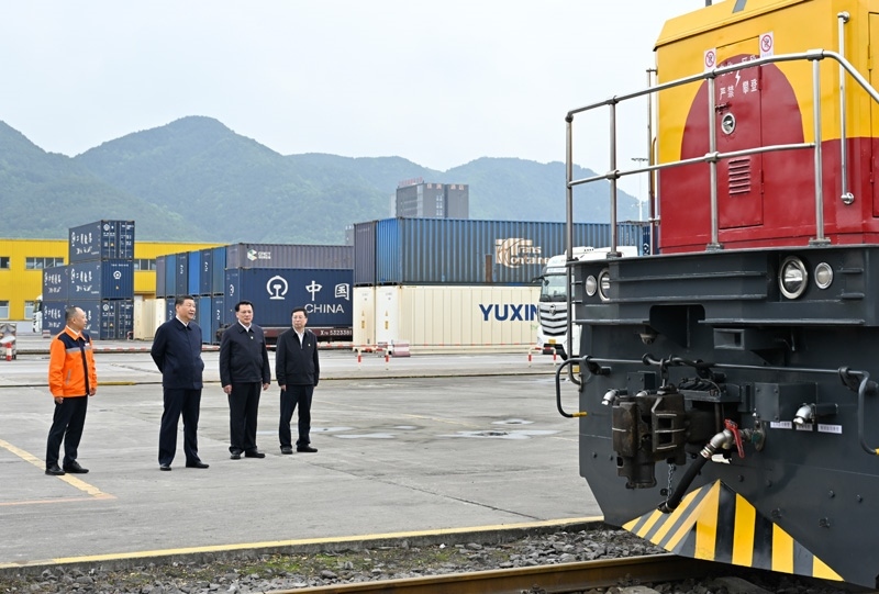 △ 2024年4月22日,習(xí)近平總書記在重慶國(guó)際物流樞紐園區(qū)重慶鐵路集裝箱中心站考察。