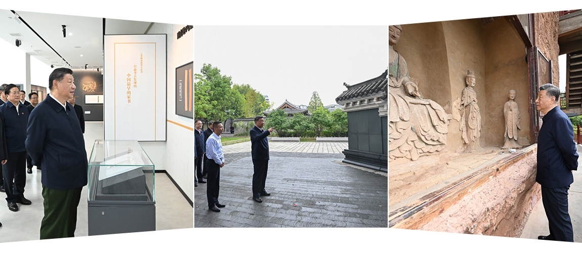 △ 自左向右分別為:2024年11月4日,習(xí)近平總書記在湖北孝感云夢(mèng)縣博物館參觀出土秦漢簡(jiǎn)牘展;2024年10月17日,習(xí)近平總書記在安徽桐城六尺巷考察;2024年9月11日,習(xí)近平總書記在甘肅天水麥積山石窟考察。