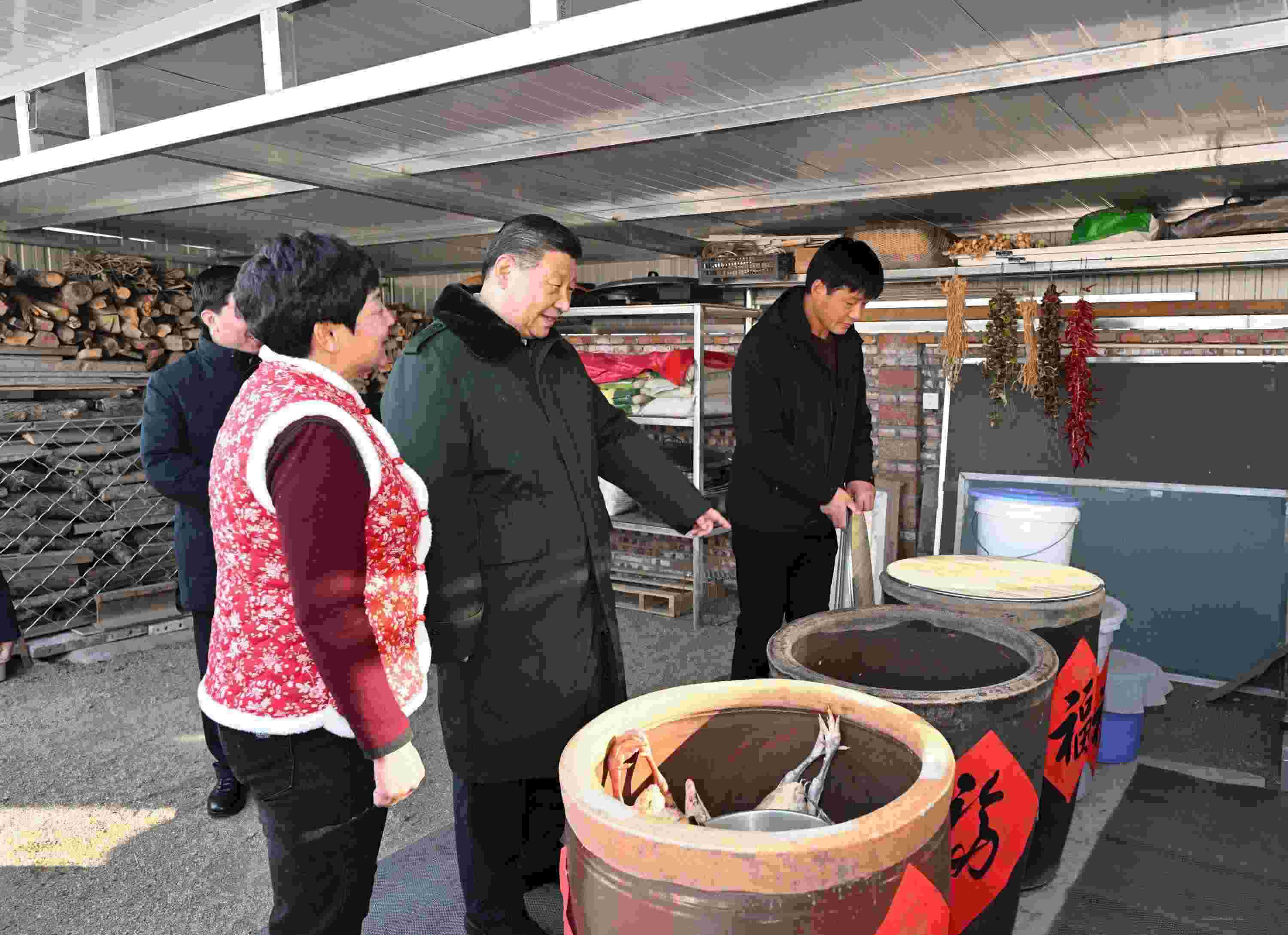 在村民師紅兵家,總書(shū)記掀開(kāi)墻邊大缸的蓋子,一一觀瞧;轉(zhuǎn)到儲(chǔ)藏室、廚房等察看年貨,然后洗手加入霍州年饃的制作。