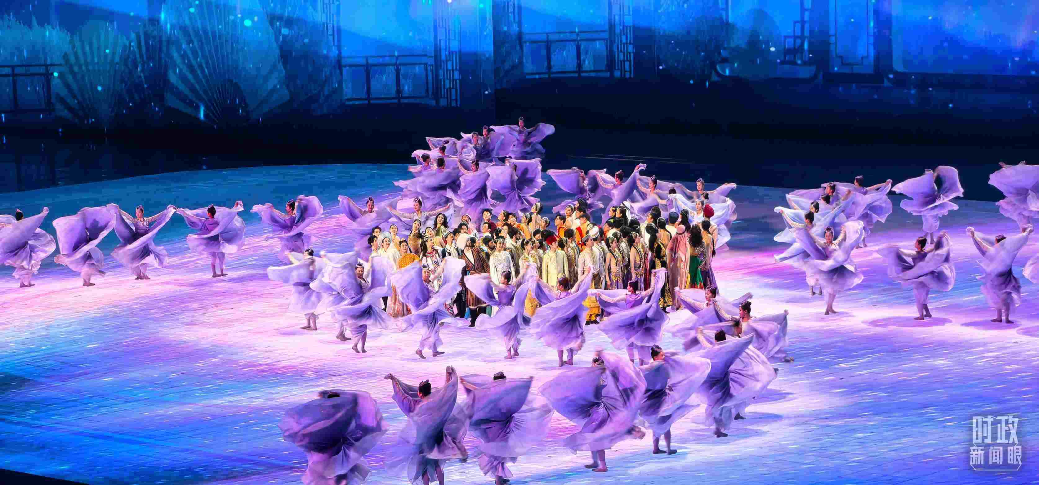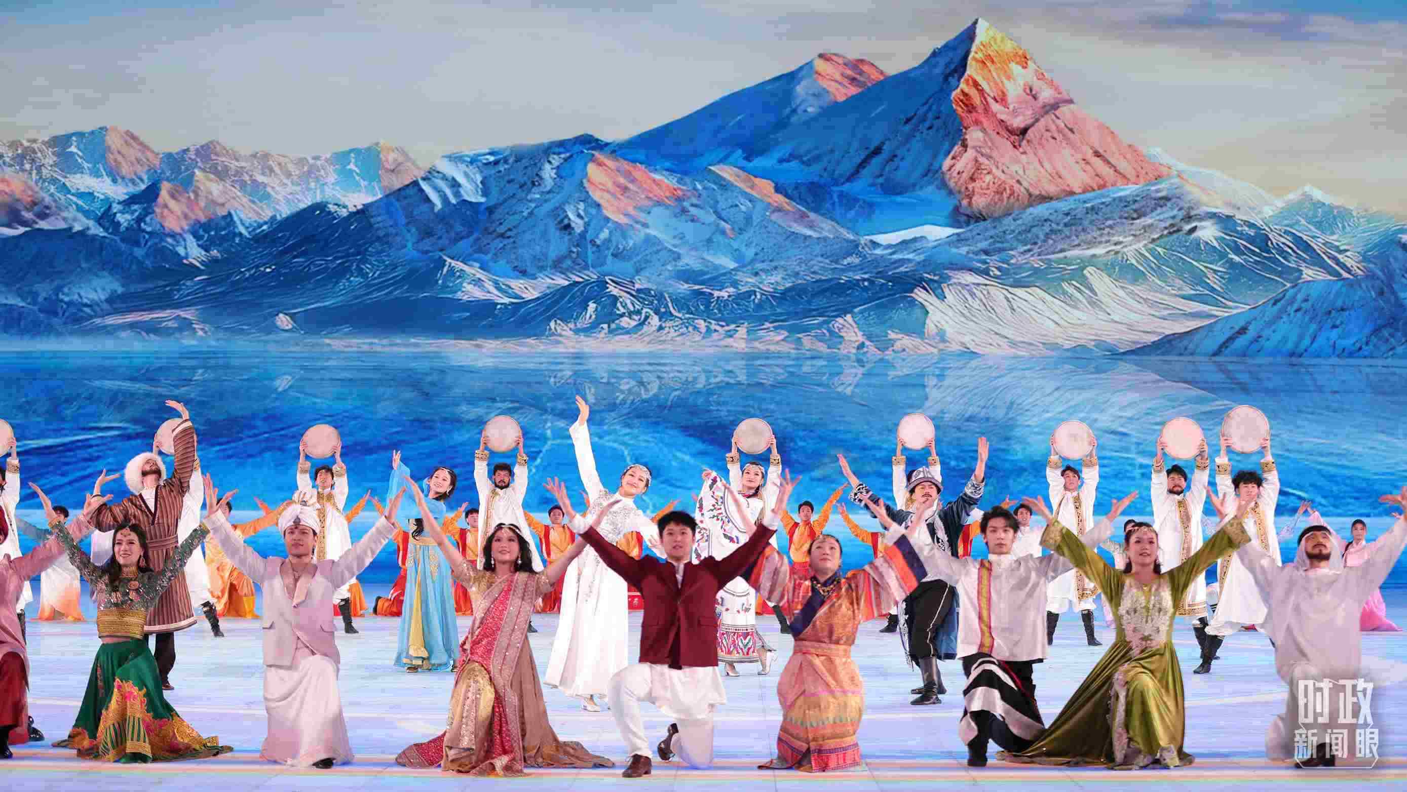 文藝表演分為上篇《熾熱冰雪》、中篇《燃情時(shí)速》、下篇《山高水長(zhǎng)》,通過《長(zhǎng)歌頌冰河》《榮光耀未來(lái)》《馳騁天地間》《璀璨嘉年華》《攜手情久長(zhǎng)》《萬(wàn)里共和鳴》等節(jié)目,展現(xiàn)化“極寒”為“極美”“極燃”“極暖”的意蘊(yùn)。