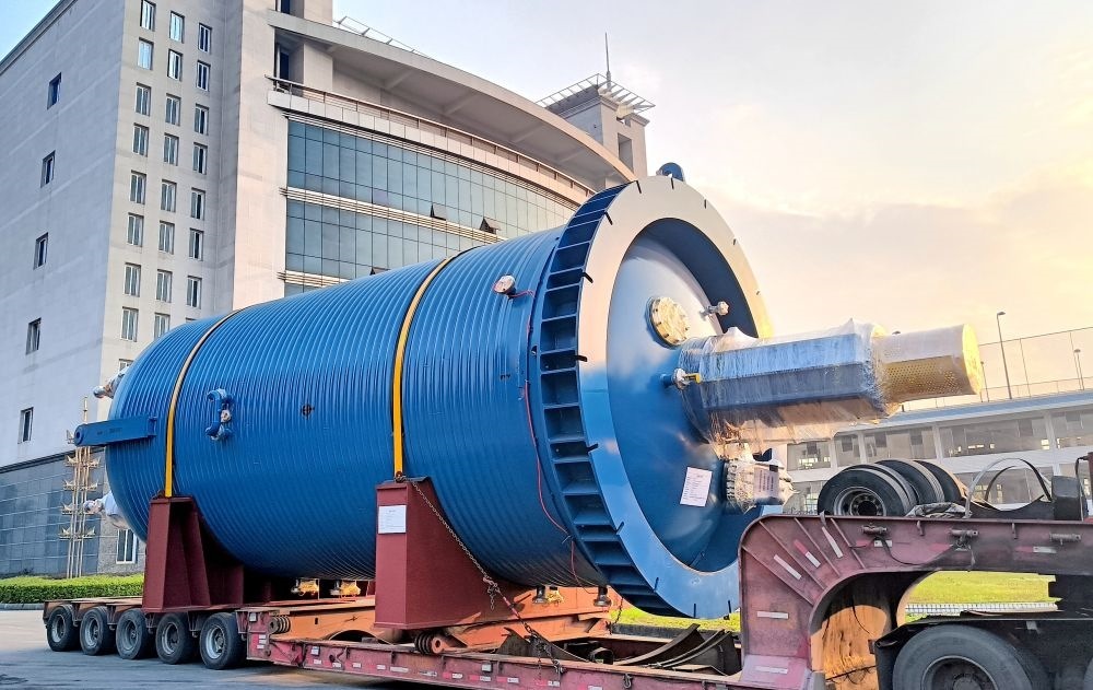 2024年1月3日,岷江實業(yè)集團生產(chǎn)的大型化工設(shè)備運輸出廠。(受訪者供圖)