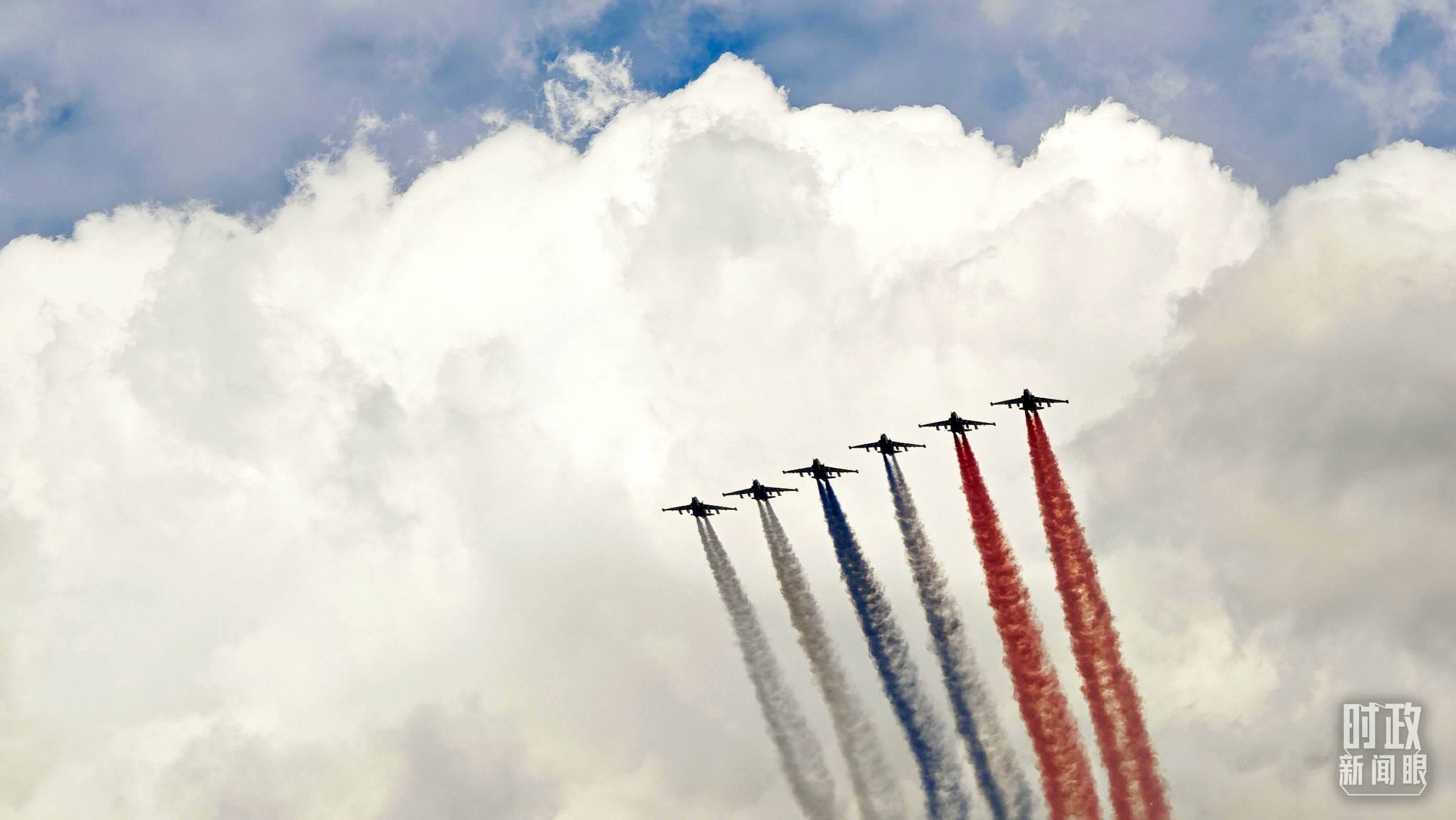 △5月7日,參加紀(jì)念蘇聯(lián)偉大衛(wèi)國戰(zhàn)爭勝利80周年慶典彩排的空中飛行梯隊(duì)飛越紅場。(總臺央視記者王哈男拍攝)