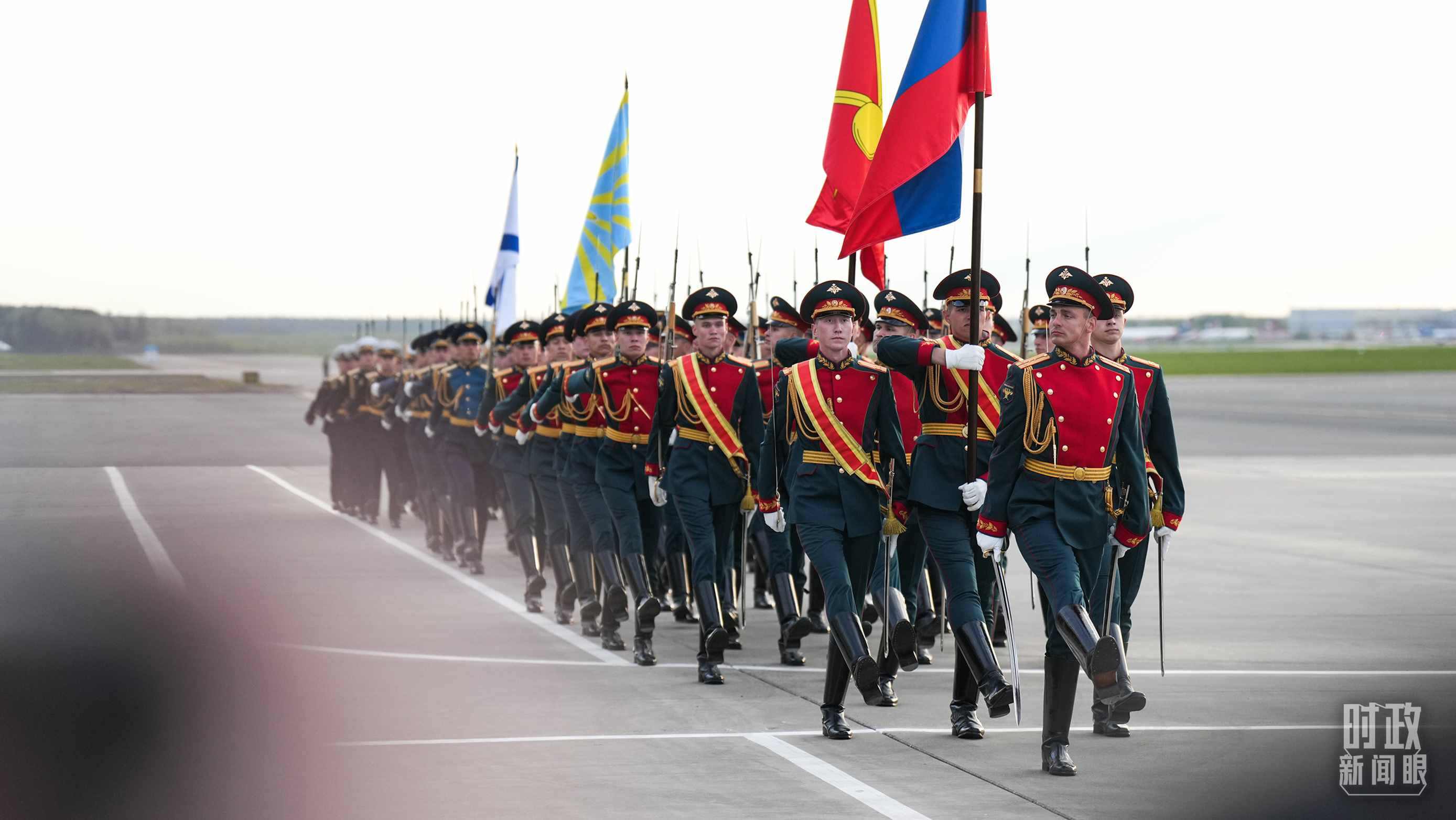 俄方在機(jī)場舉行隆重迎接儀式。軍樂團(tuán)奏中俄兩國國歌。習(xí)主席檢閱儀仗隊(duì)并觀看分列式。