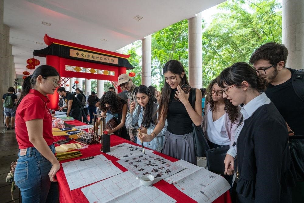 △2025年4月,在巴西里約熱內(nèi)盧天主教大學舉辦的“國際中文日”慶?;顒由?,學生們體驗中文書法。