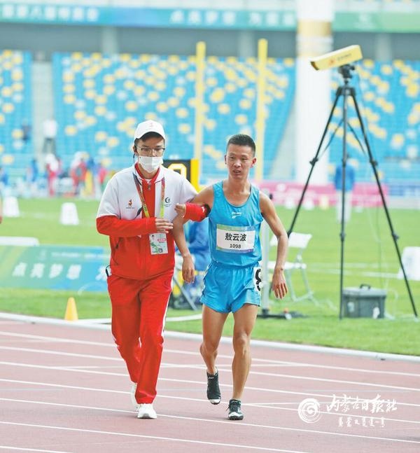 志愿者攙扶內(nèi)蒙古殘疾人運動員敖云波。